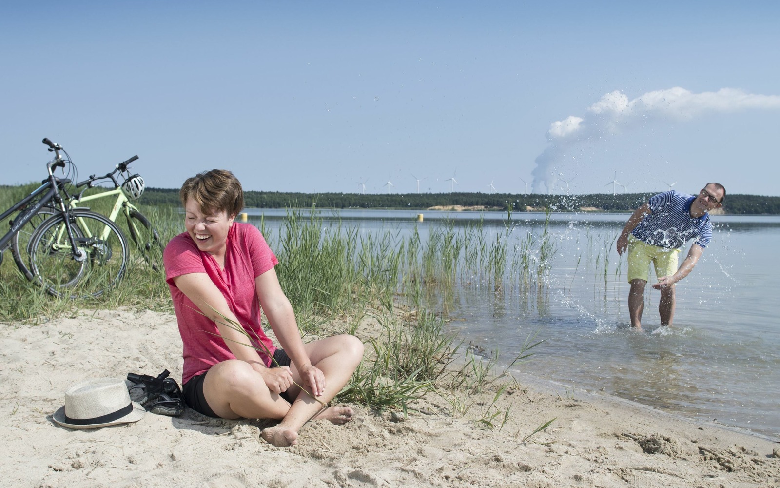 Cyklisté odpočívající na pláži jezera Scheibe-See, Foto: Nada Quenzel, Lizenz: Tourismusverband Lausitzer Seenland e.V.
