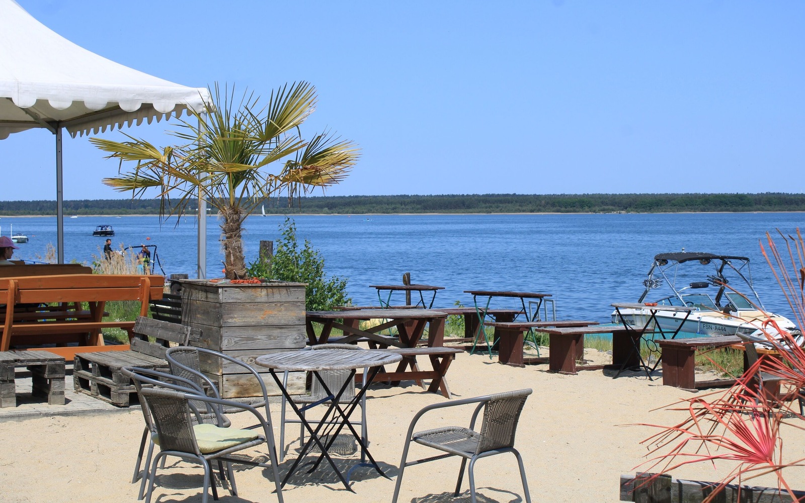Poté nebo během dne si můžete vychutnat chladivé nápoje a občerstvení v wake baru v areálu. Odpočívat můžete na terase na pláži, odkud je krásný výhled na Geierswaldské jezero a kde můžete z bezpečné vzdálenosti obdivovat vodní podívanou.