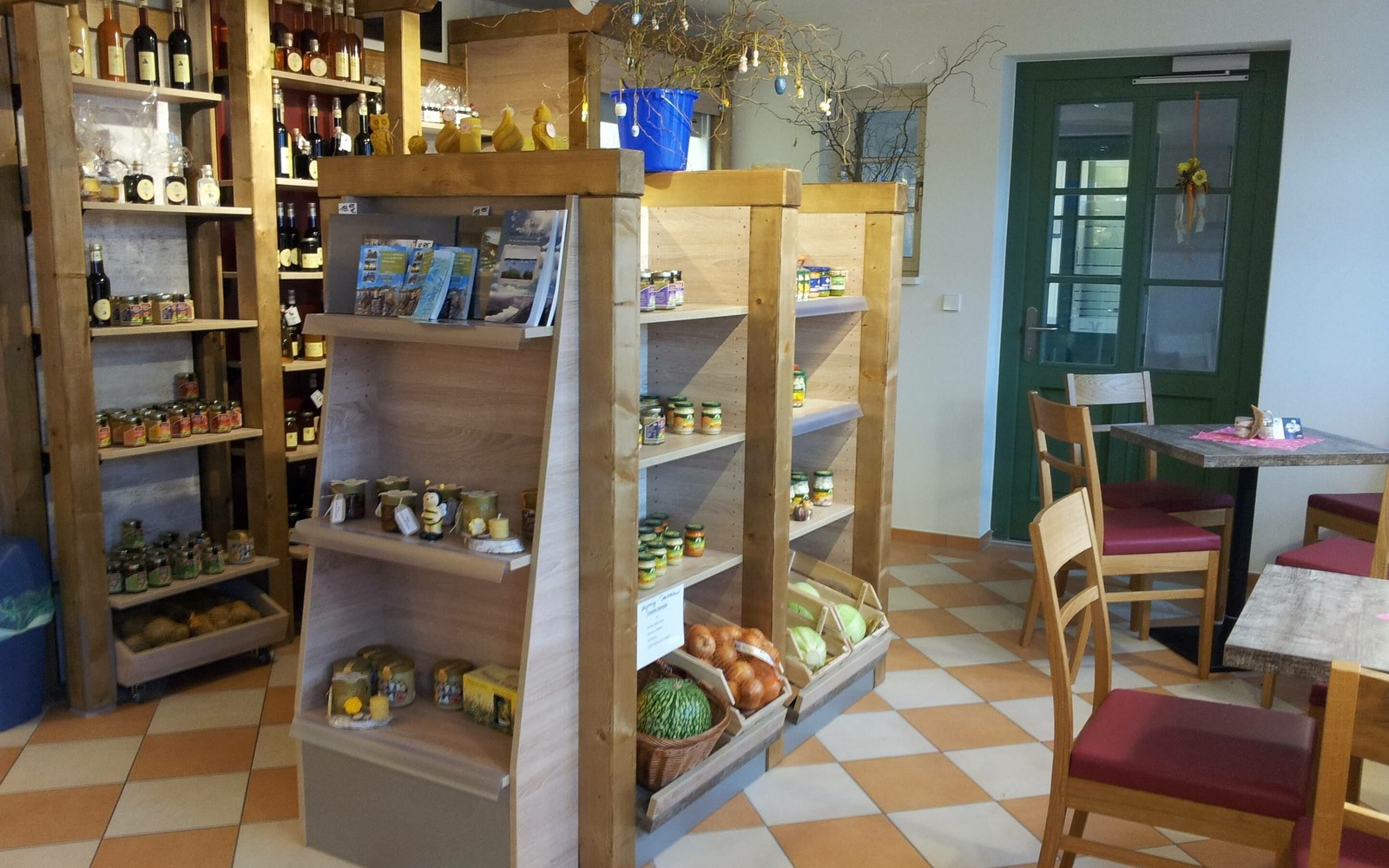 Im Hofladen gibt es ein Frühstücks- , Mittags- und Kaffeeangebot: Imbiss, Tagessuppen, Kaffee & Kuchen und regionale offene Weine.