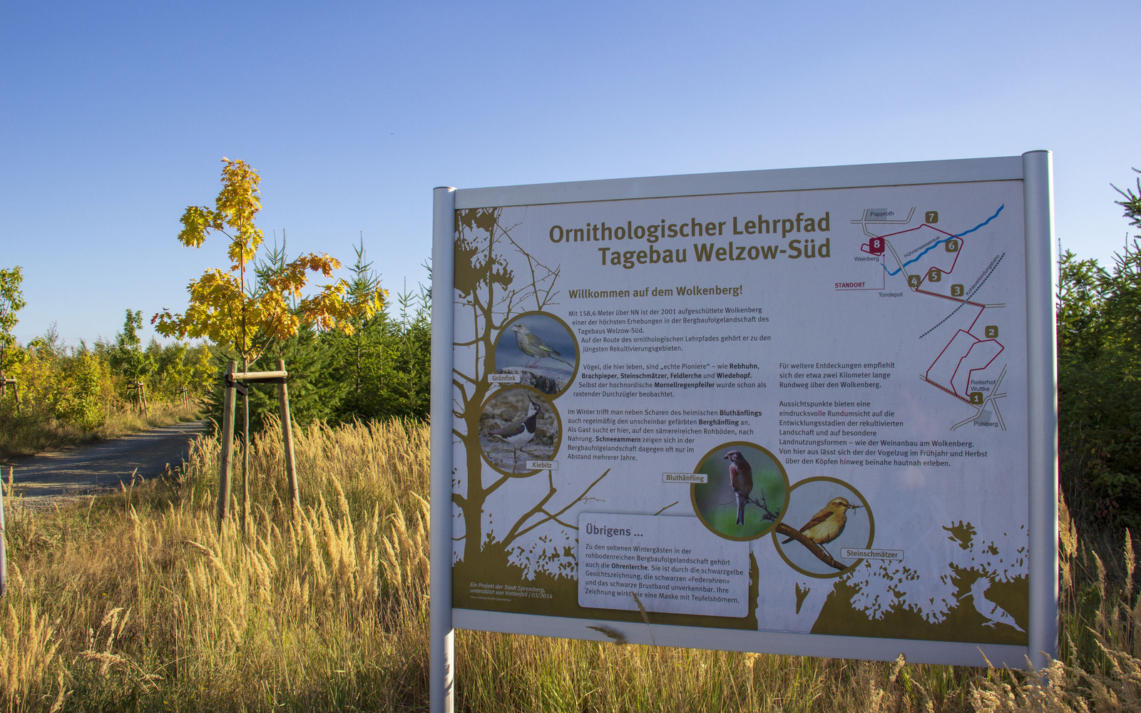 Tipp: Der Aussichtspunkt Wolkenberg ist Teil eines ornithologischen Lehrpfades, der im Spremberger Ortsteil Pulsberg beginnt. Von dort aus führt er durch unterschiedliche Entwicklungsstadien der Rekultivierungsflächen und bietet die Möglichkeit, für die Bergbaufolgelandschaft charakteristische Vogelarten zu beobachten.