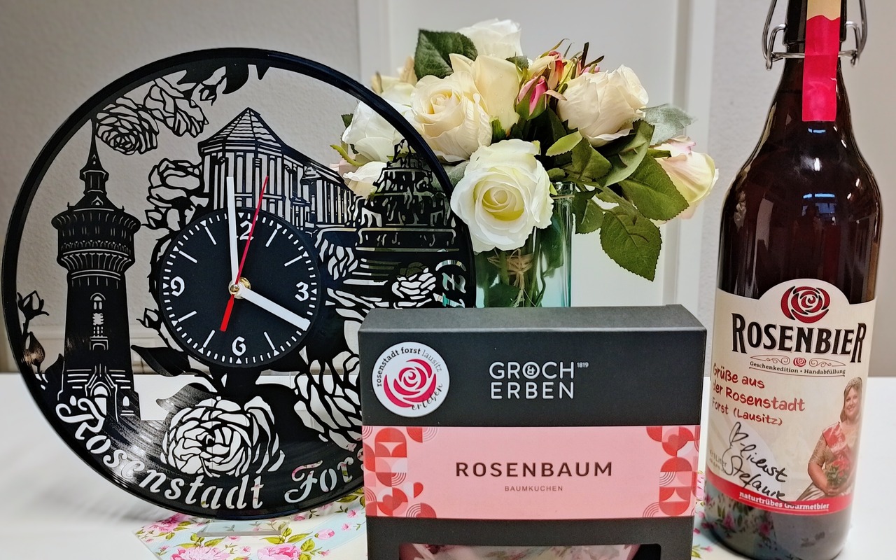 Mit Liebe handgemacht und aus besten, natürlichen Zutaten. Inspiriert von den Rosen der Stadt. Hergestellt in der Cottbuser Baumkuchen Manufaktur "Groch & Erben", der Rosenbaumkuchen - für alle, die das Besondere suchen. Eine ganz besondere Forster Spezialität ist das Rosenbier aus der Landskron BRAU-MANUFAKTUR. Oder wie wäre es mit einem originellen Andenken – zum Beispiel einer dekorativen Wanduhr mit den schönsten Sehenswürdigkeiten der Stadt?