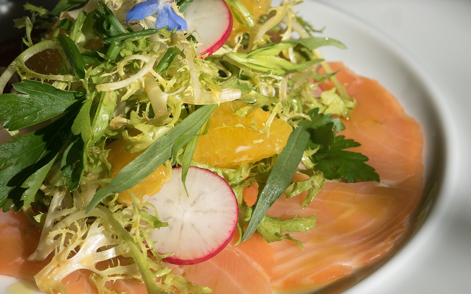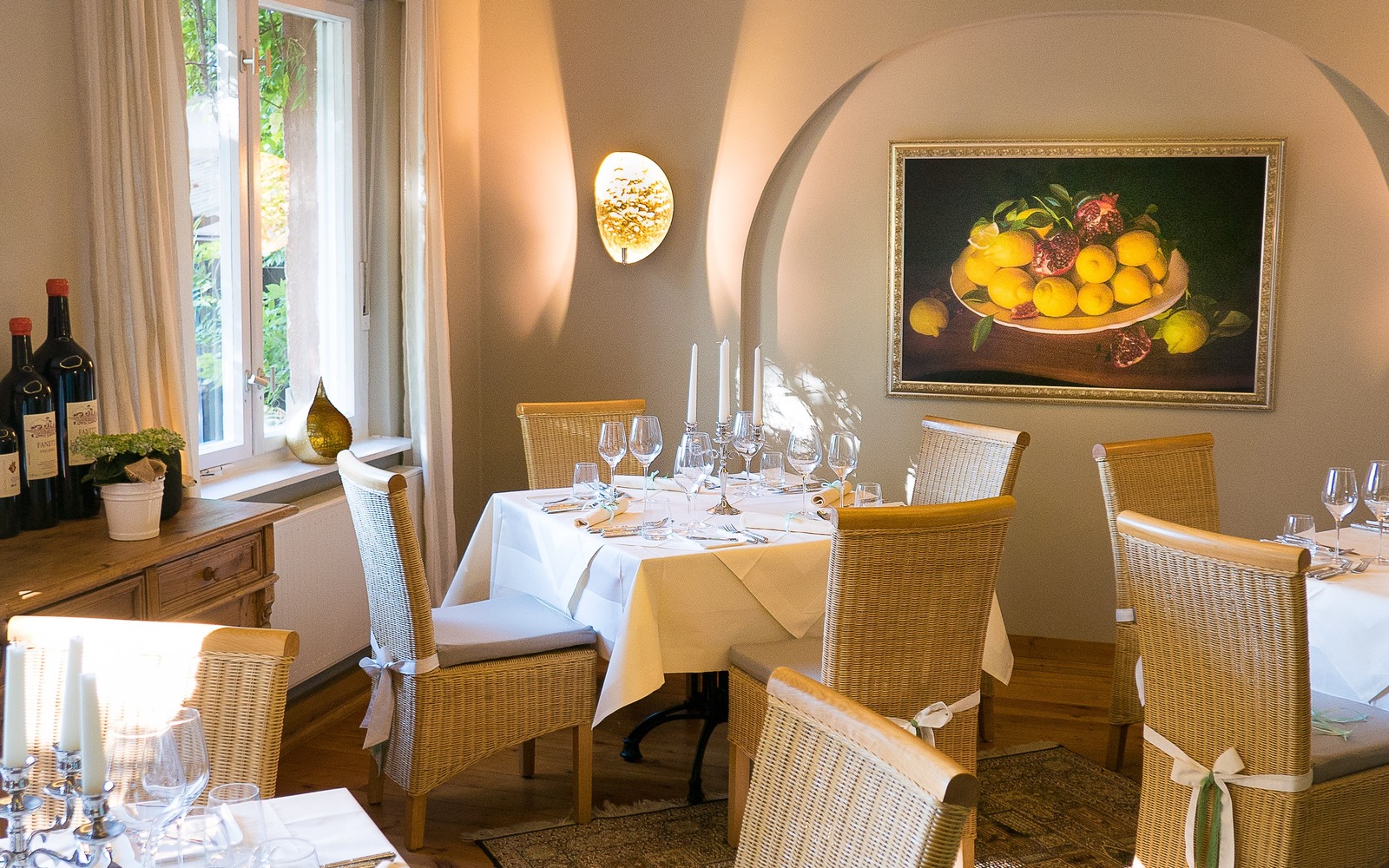 Im Sommer werden sowohl klassische als auch neue raffinierte Flammkuchen-Kreationen aus erstklassigen regionalen Zutaten serviert. Die Gäste speisen unter freiem Himmel inmitten des mediterranen, duftenden Kräutergartens im Sonnenuntergang.