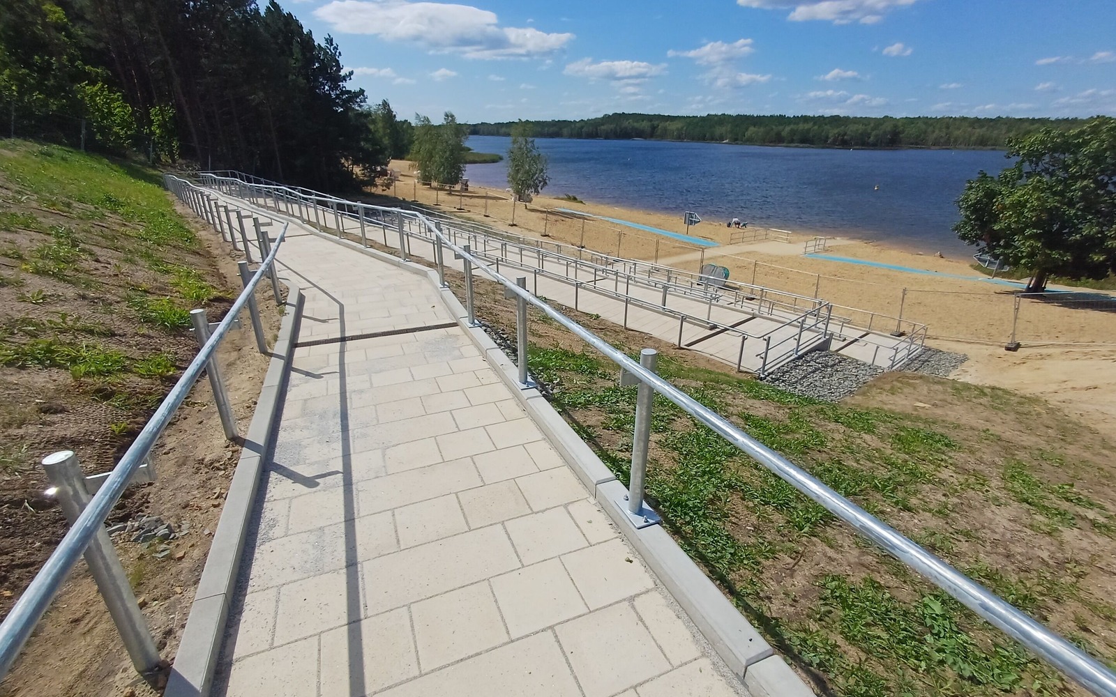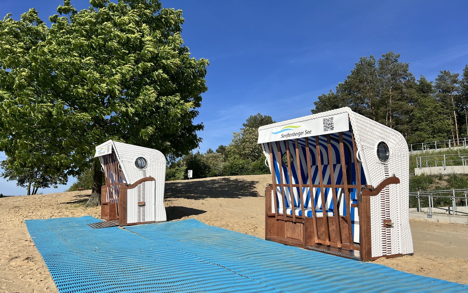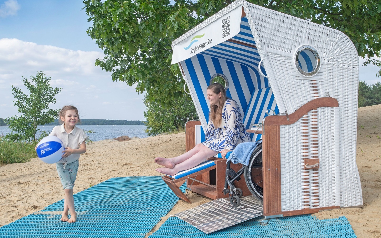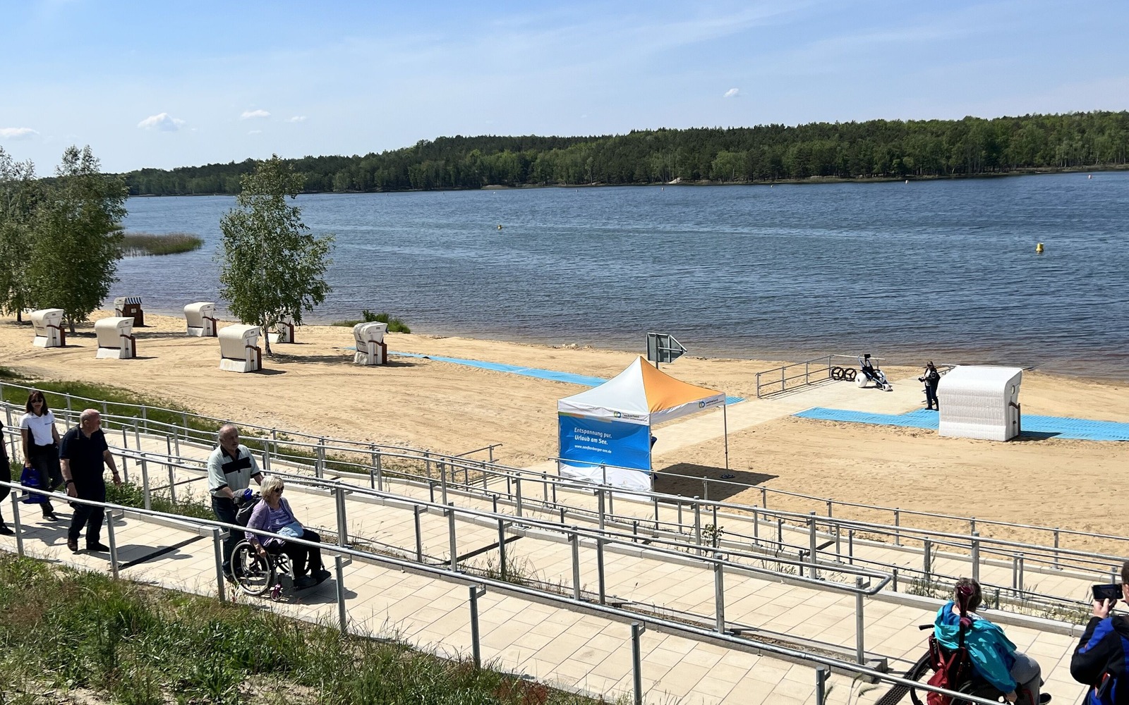 Das barrierefreie Angebot im Familienpark Senftenberger See in Großkoschen ist umfangreich. Für Menschen mit Mobilitäts- und Seheinschränkungen wird der direkte Weg bis ans und sogar ins Wasser möglich. Für entspannte Stunden laden die barrierefreien Strandkörbe ein. Neben einen barrierefreien Strandzugang ermöglicht ein Amphibienrollstuhl den sicheren Zugang ins kühle Nass. Das Orientierungssystem "Piepsy" bietet klare Hinweise für Menschen mit Sehbehinderung und zusätzlich ist das Geländer der Rampe mit Brailleschrift versehen. Mit diesem barrierefreien Angebot wird der Familienpark zu einem Ort der Begegnung und Teilhabe.