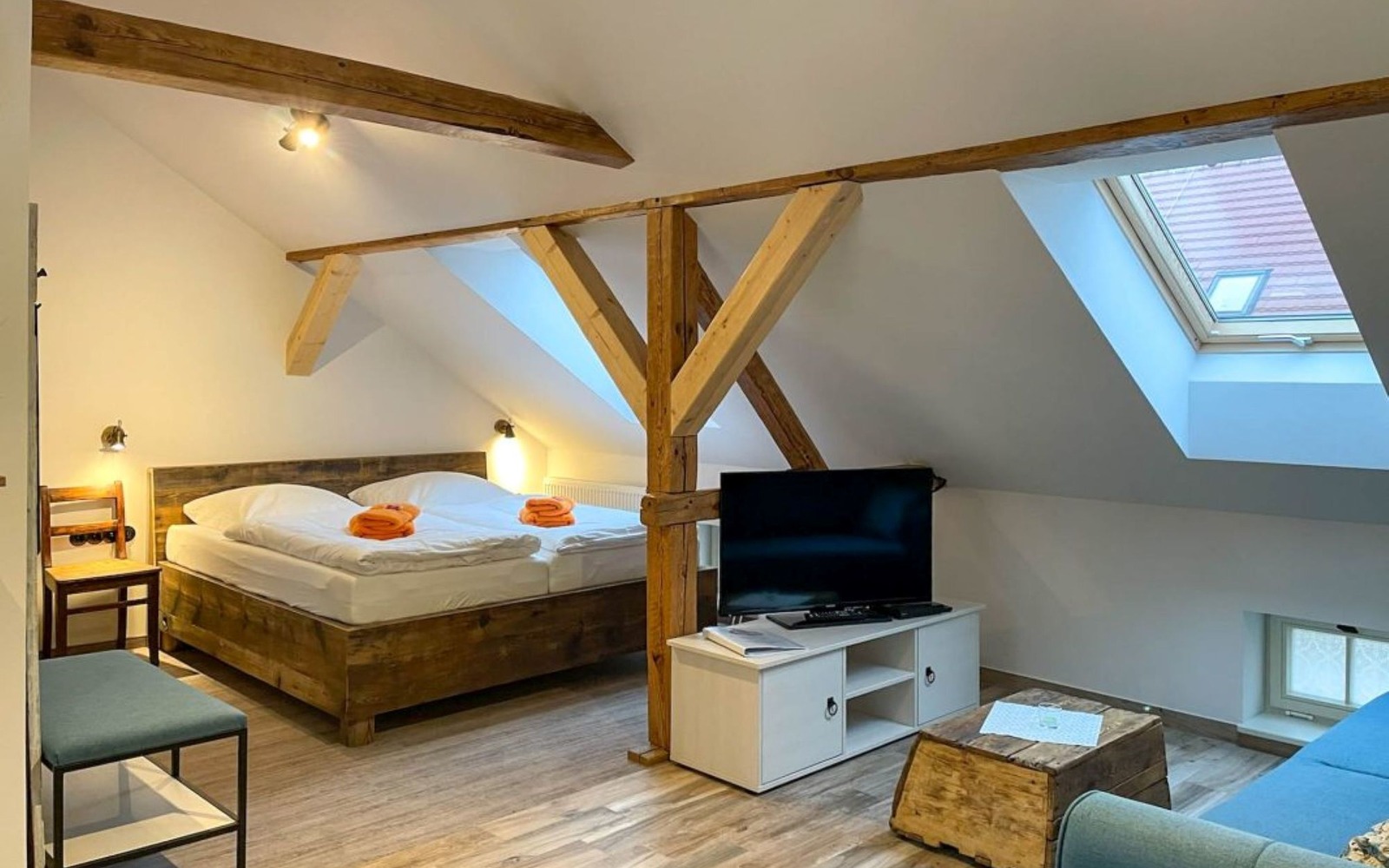 - Schlafzimmer und gemütlicher Wohnbereich mit TV und DVD-Player,