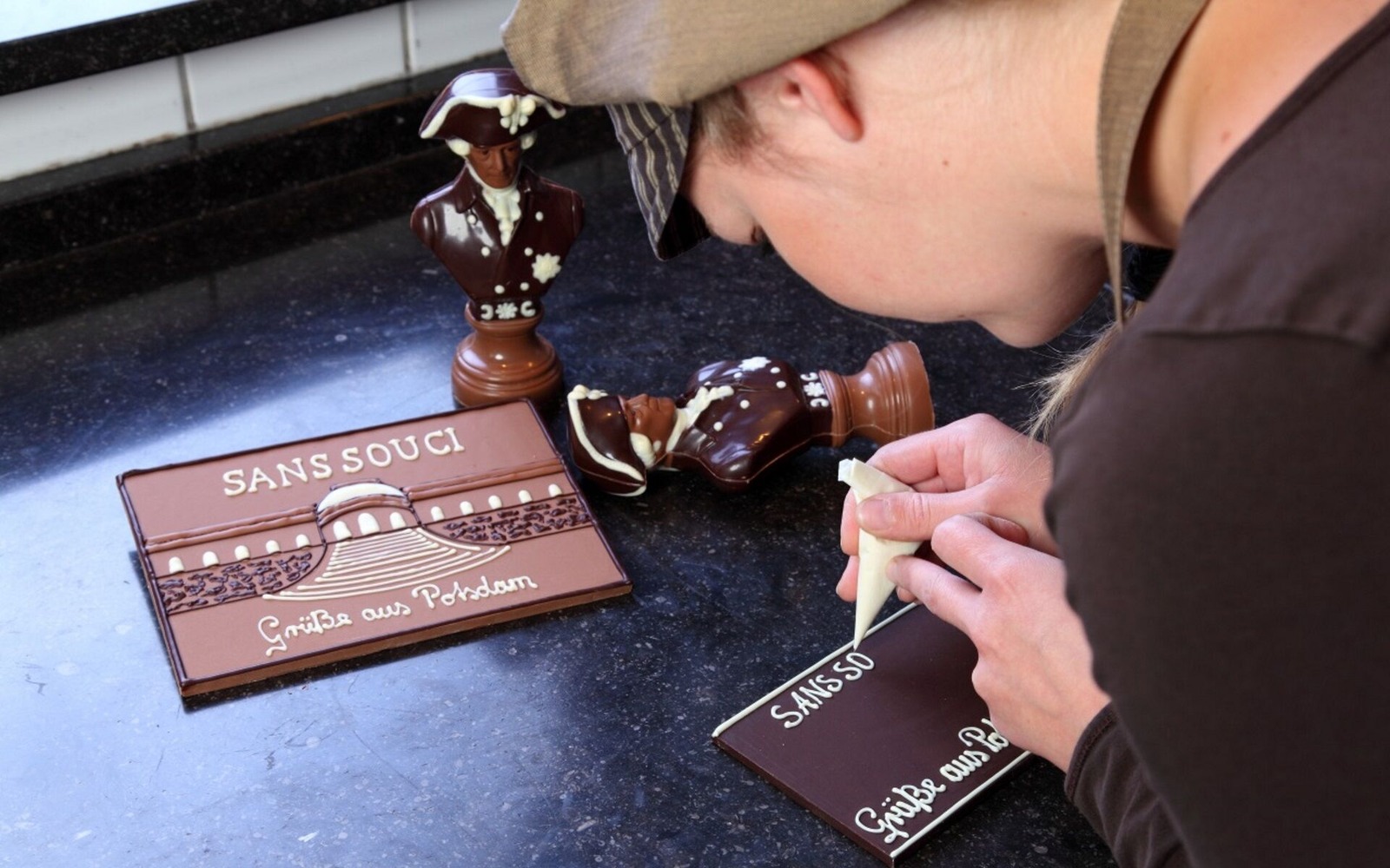 In der Mitmach-Schauwerkstatt kann man sich beim Erlebnis Schokomalerei gleich selbst als Chocolatier probieren. Neben den Pralinenseminaren werden interessante Führungen angeboten.