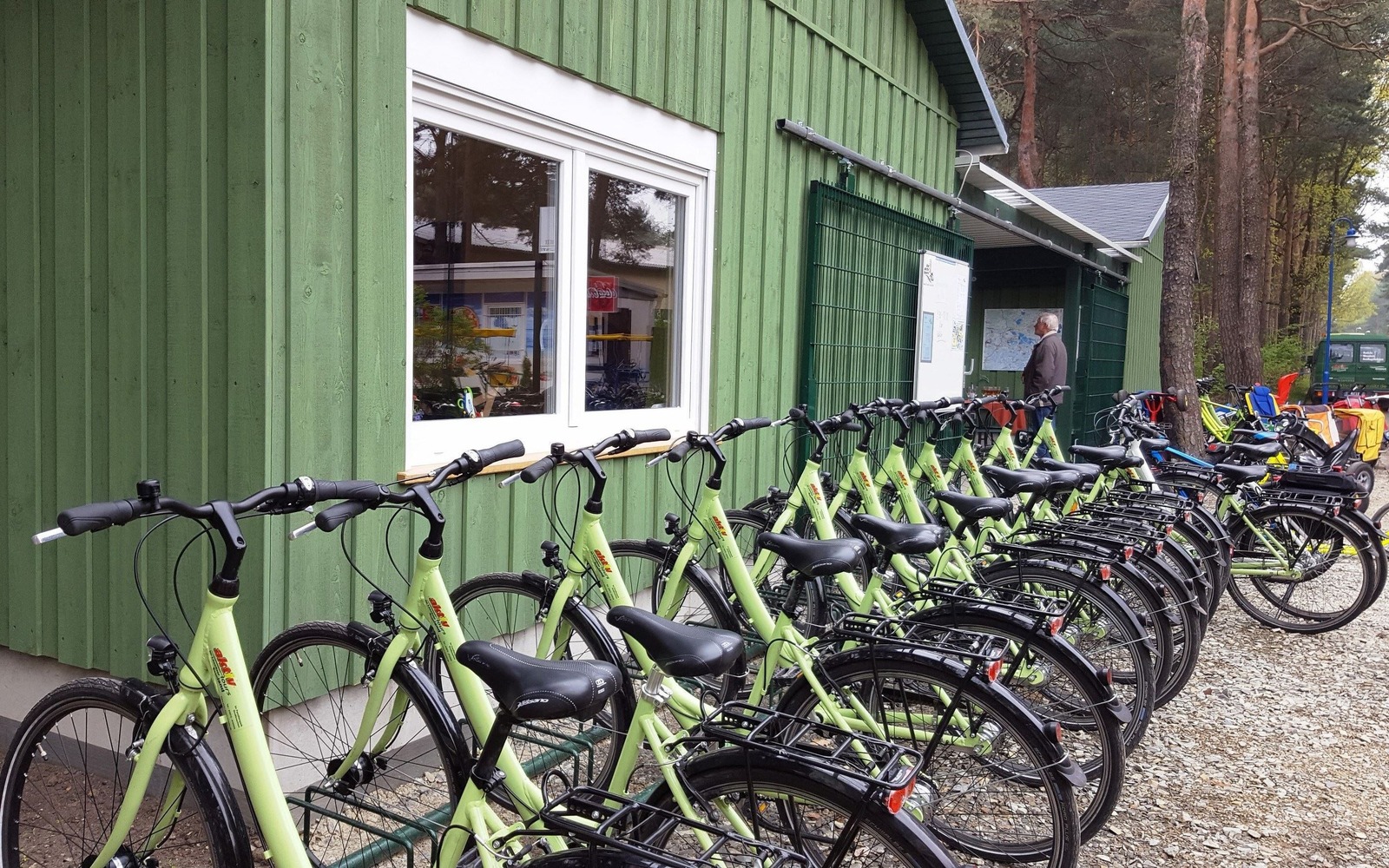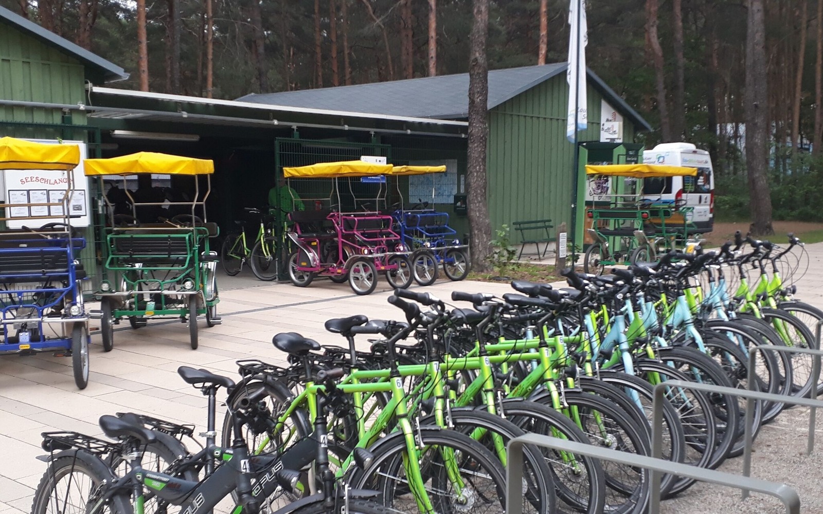 Fahrradvermietung im Familienpark Großkoschen am Senftenberger See. Im Radstützpunkt werden Fahrräder für Erwachsene und Kinder, E-Bikes, Tandems, Handbikes, sowie Kindersitze und -anhänger und zahlreiche verschiedene Tretmobile und Go-Karts vermietet.