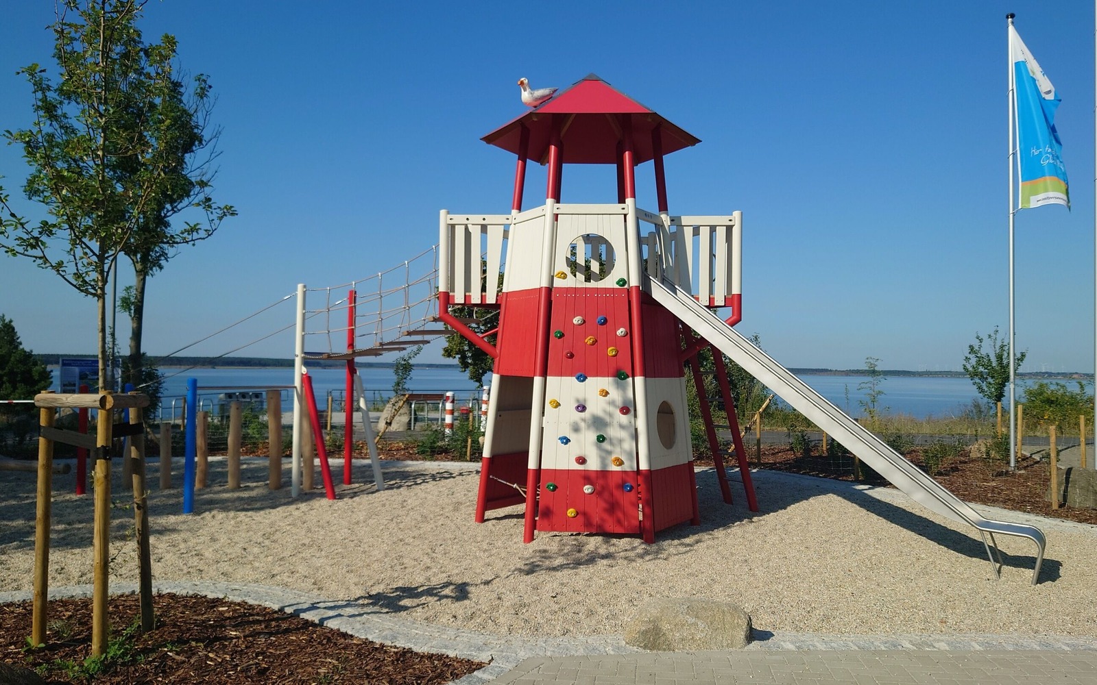 Der Spielplatz am Seestrand Lieske ist thematisch an Wasser und Seefahrt angelehnt und für Kinder bis drei Jahre sowie für ältere Kinder von vier bis zwölf Jahren konzipiert. Die Spielgeräte aus Edelstahl und Robinie sind wetterbeständig und passen gut zum Seeklima. Für die kleineren Kinder gibt es ein Spielschiff mit Bullaugen, Kletterelementen und einer Rutsche. Größere Kinder werden durch einen knapp fünf Meter hohen Leuchtturm mit einer zweieinhalb Meter hohen Plattform angesprochen, die einen Ausblick über den See bietet. Der Turm ist über Buhnen und Kletterelemente wie eine Boulderwand erreichbar und hat eine große Rutsche. Eine Schaukelkombination und ein Picknickplatz unter einem Apfelbaum ergänzen das Angebot. Die Spielgeräte sind mit Fallschutzkies abgesichert.
