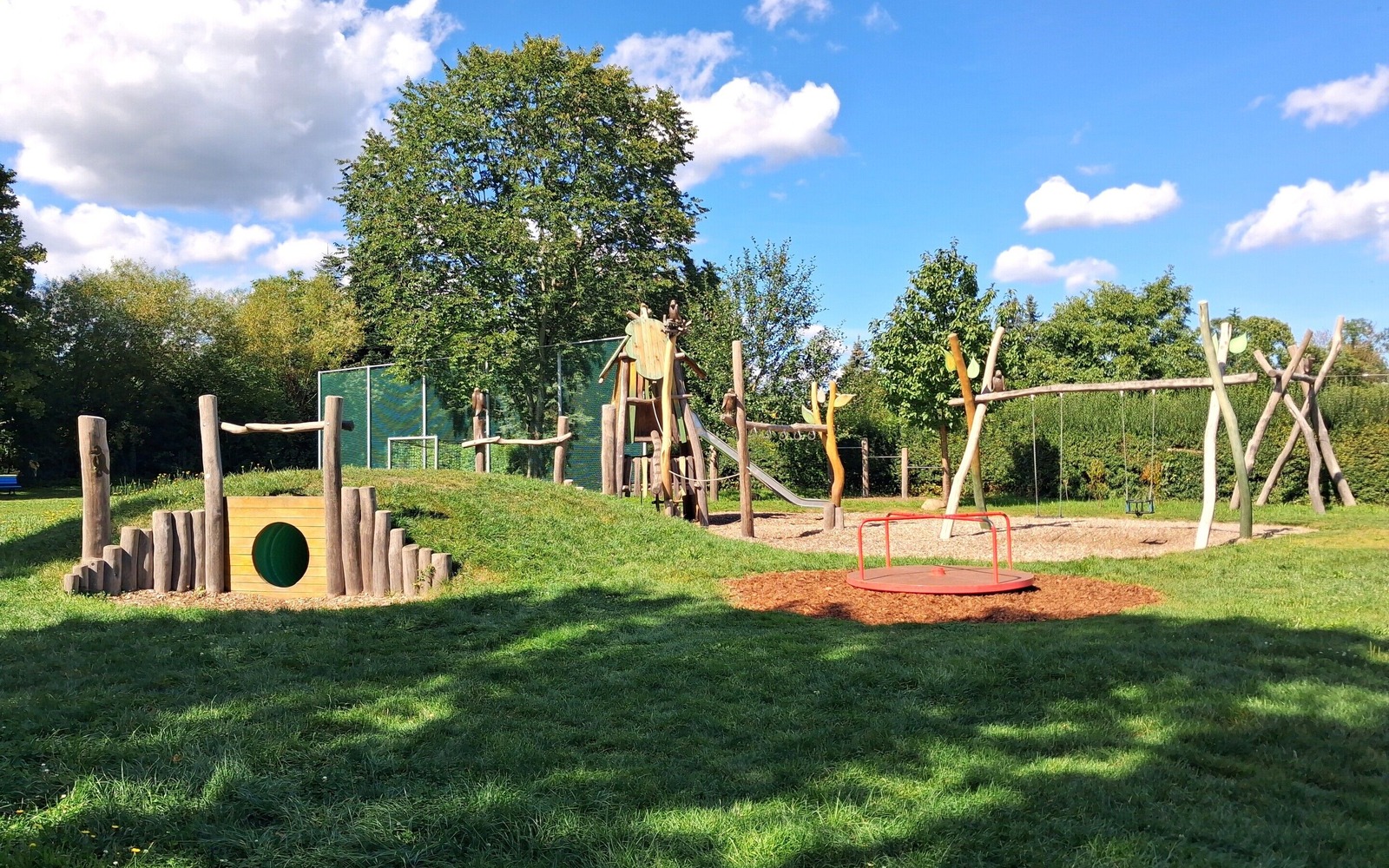 Besonders charmant ist die Gestaltung mit geschnitzten Holzskulpturen von Raben, die dem Spielplatz seinen Namen „Rabennest“ verleihen und für einen individuellen Charakter sorgen.