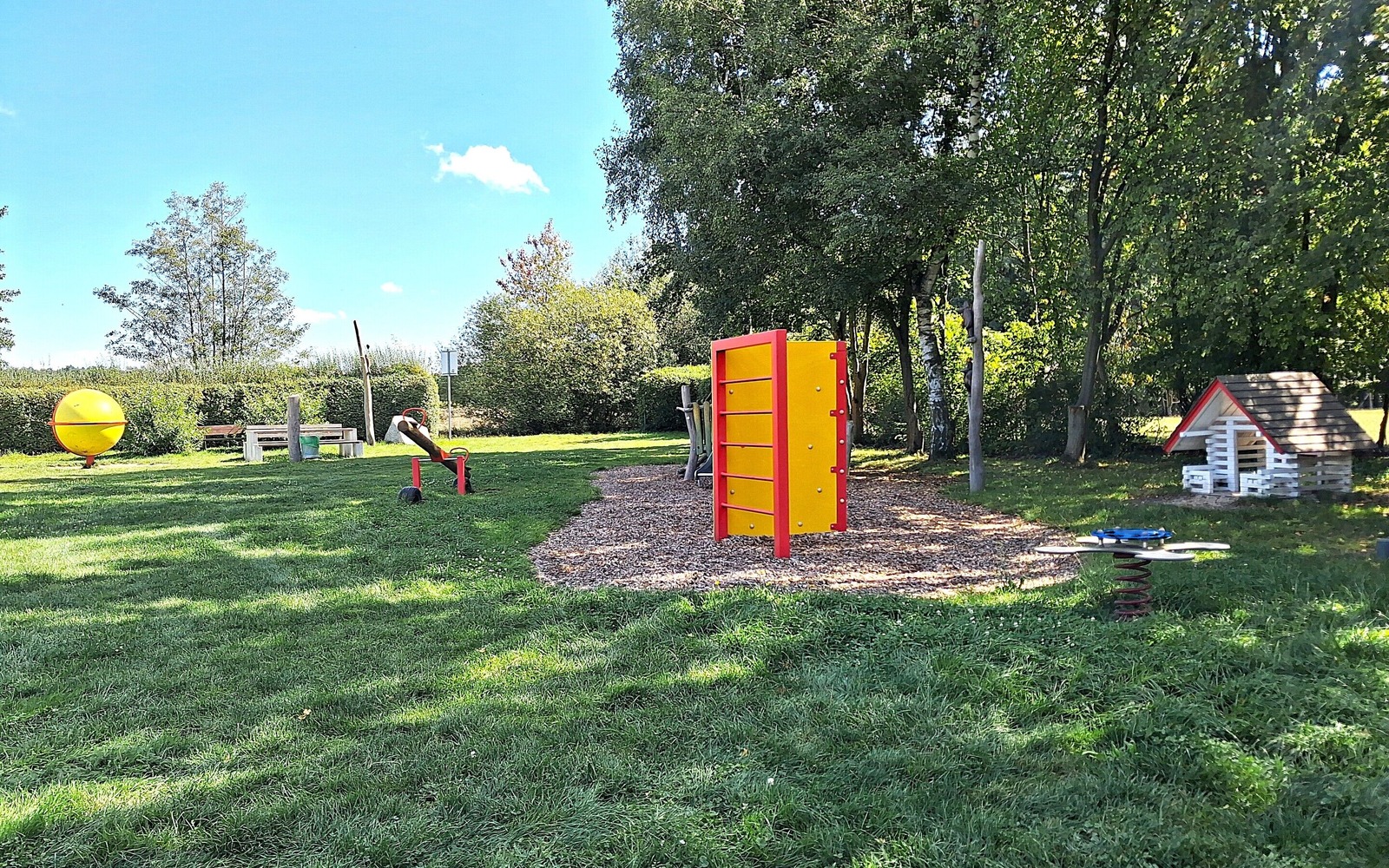 Moderne Sitzgelegenheiten laden zum Verweilen ein und bieten Platz für eine Pause oder ein Picknick. Die gepflegte Rasenfläche, Hecken und Bäume sorgen für eine naturnahe Atmosphäre. Am Eingang informiert eine Hinweistafel über die Spielplatzregeln.