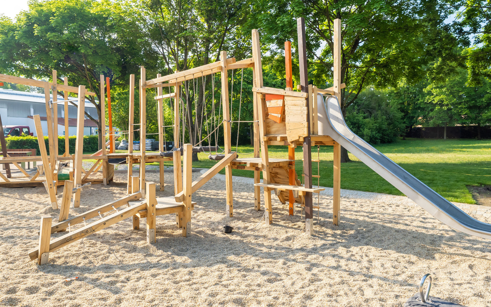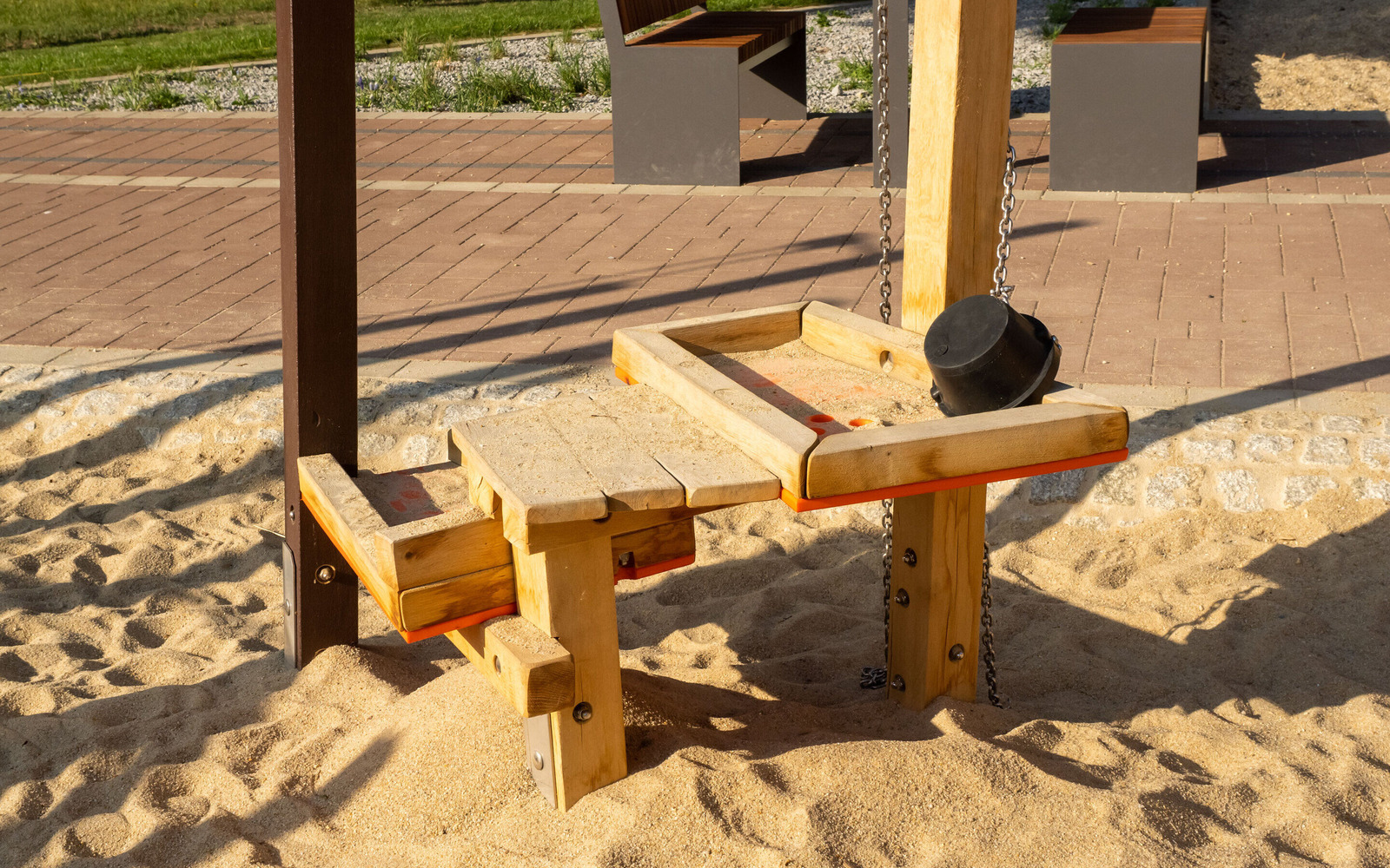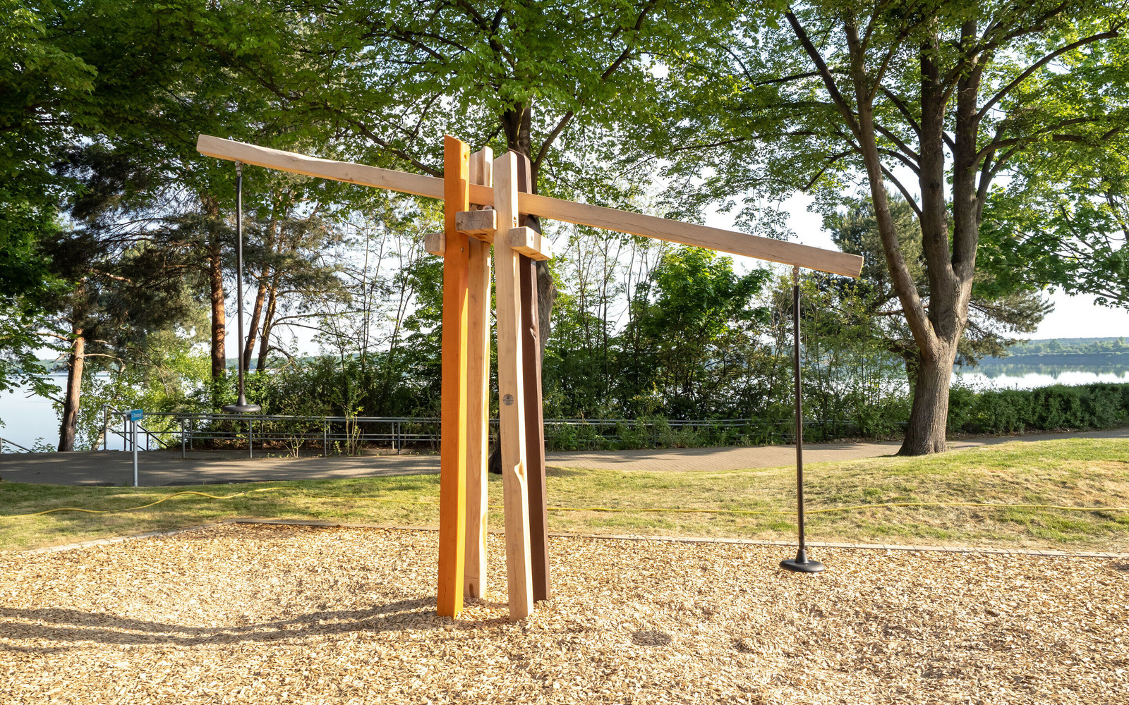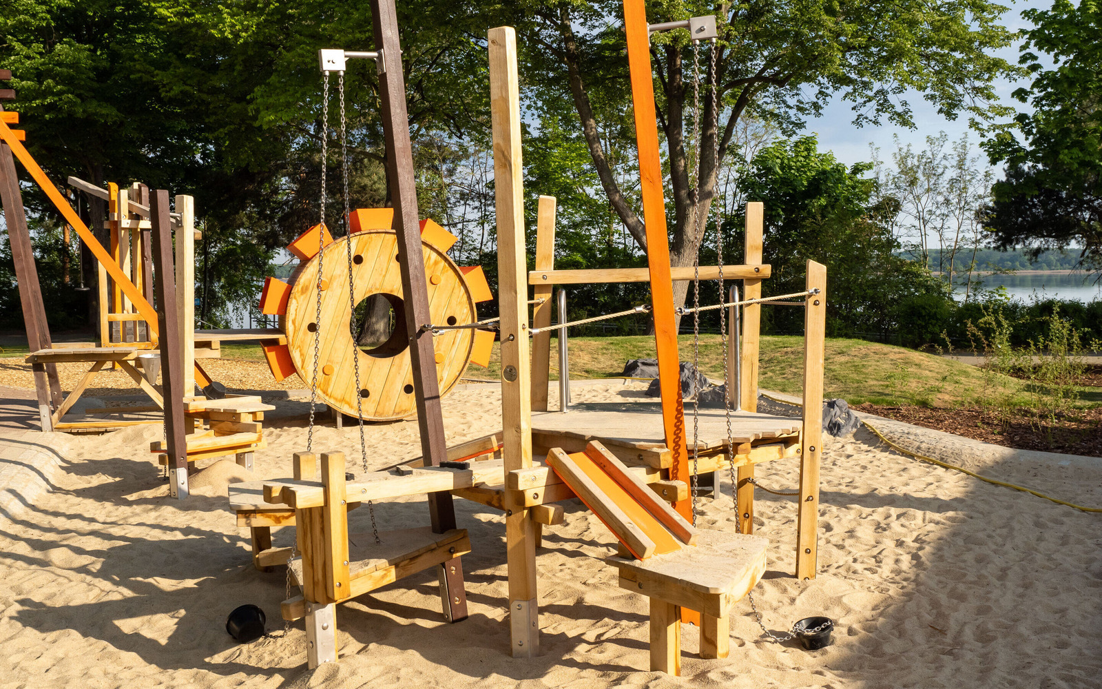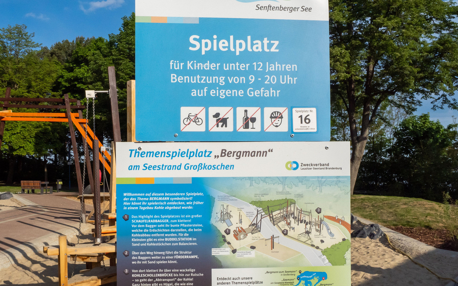 Am Seestrand in Senfteberg/ OT Großkoschen entstand ein spannender Ort, an dem Kinder bis 12 Jahre die bergbauliche Geschichte der Lausitz spielerisch entdecken können. Unter dem Motto „Bergmann“ greift die Anlage zentrale Elemente des ehemaligen Lausitzer Braunkohletagebaus auf. Highlight ist ein großer Schaufelradbagger, der beklettert werden kann. Ergänzt wird das Angebot durch eine Förderrampe mit Buddelstation, eine wackelige Kohlenschollenbrücke und eine Rutsche, die den Abtransport der Kohle nachempfindet. Auch die Gestaltung des Geländes erinnert an den Tagebau: Erhebungen in Braun symbolisieren Abraumhalden. Der Spielplatz macht den Strukturwandel in der Region auf kindgerechte Weise erlebbar