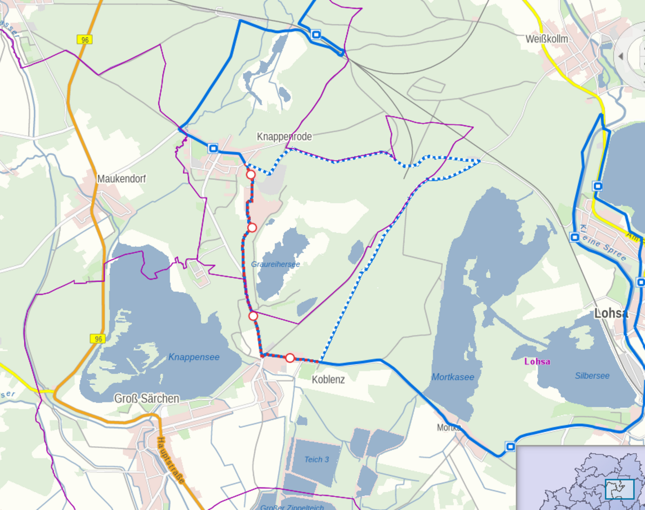 Auf der Seenland-Route Etappe 3 und der Niederlausitzer Bergbautour Etappe 7 gilt ab sofort bis auf Weiteres eine Teilsperrung entlang der K9207 in der Nähe des Knappensees. Eine Umleitung ist ausgeschildert und in der Grafik (gestrichelte Linie) dargestellt. Die Umleitungsstrecke hat eine Länge von 7,5 Kilometern. Es entsteht ein Mehrstrecke von 2 Kilometern.