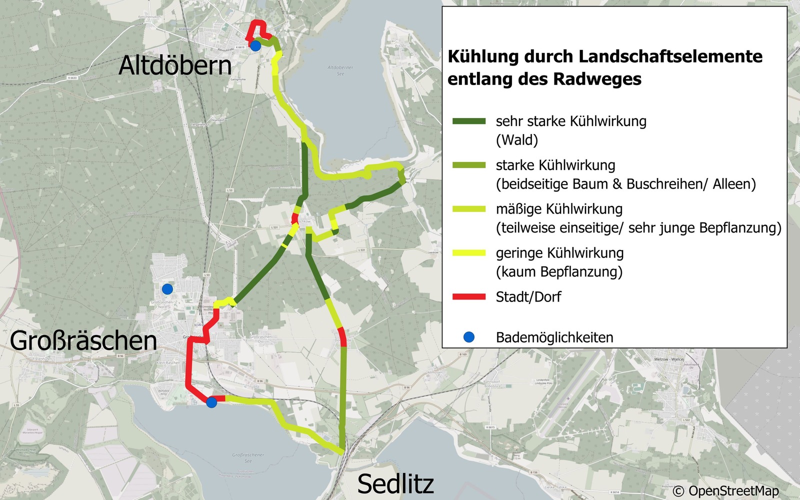 Die Route verläuft größtenteils entlang von Wäldern sowie Baum- und Buschreihen, die für angenehme Temperaturen während des Ausflugs sorgen. Für eine willkommene Abkühlung bieten sich unterwegs mehrere Bademöglichkeiten an – etwa der Strand am Großräschener See, das Freizeit- und Erholungszentrum in Großräschen oder das Freibad in Altdöbern. Cafés entlang der Strecke laden zum Verweilen ein, und die Wasserflasche lässt sich am Wasserspender neben der Touristeninformation in Großräschen auffüllen.
