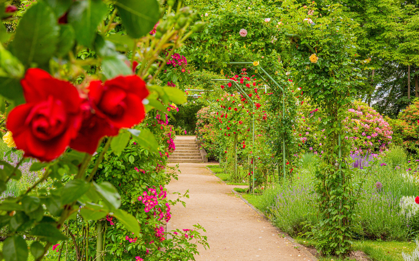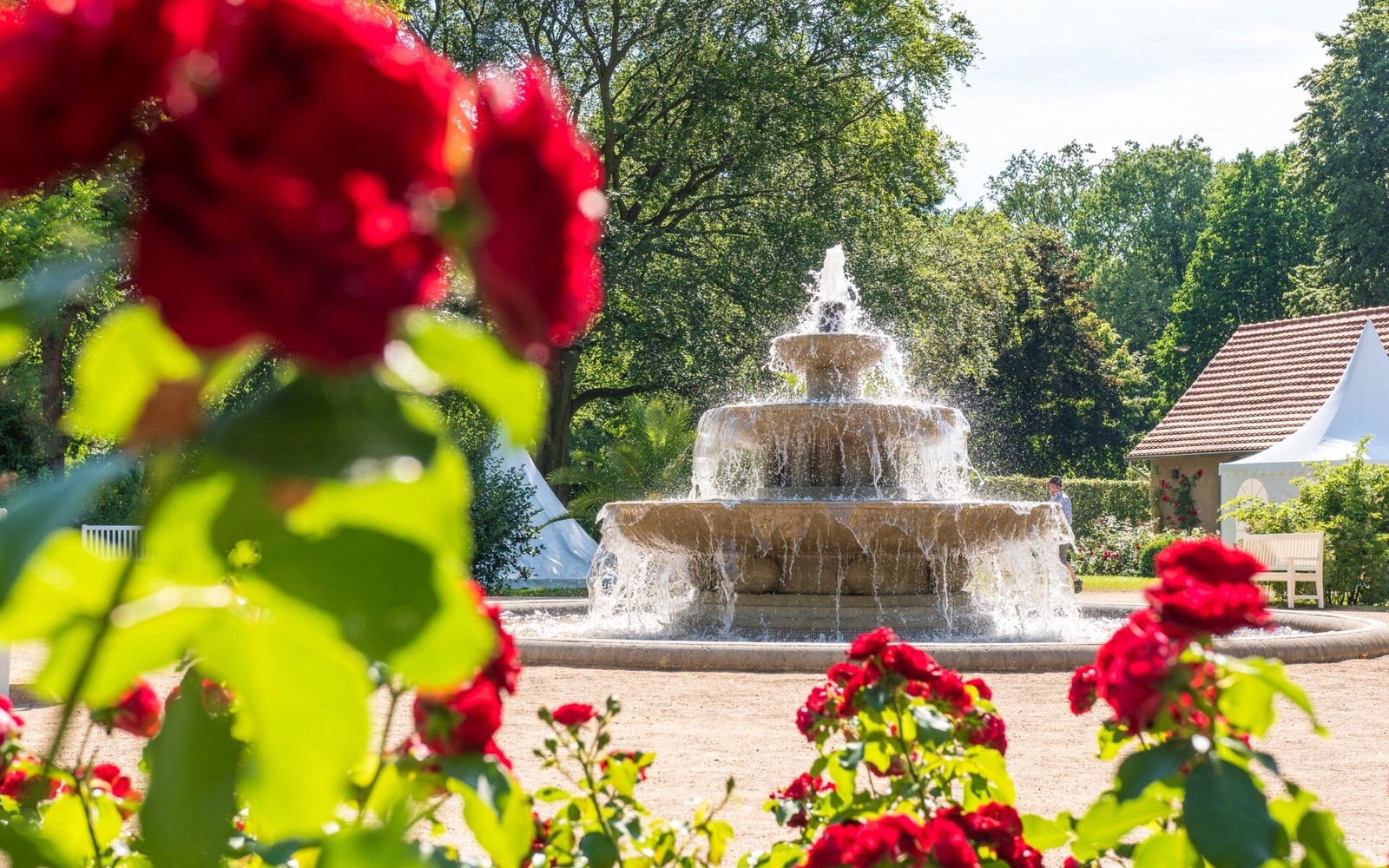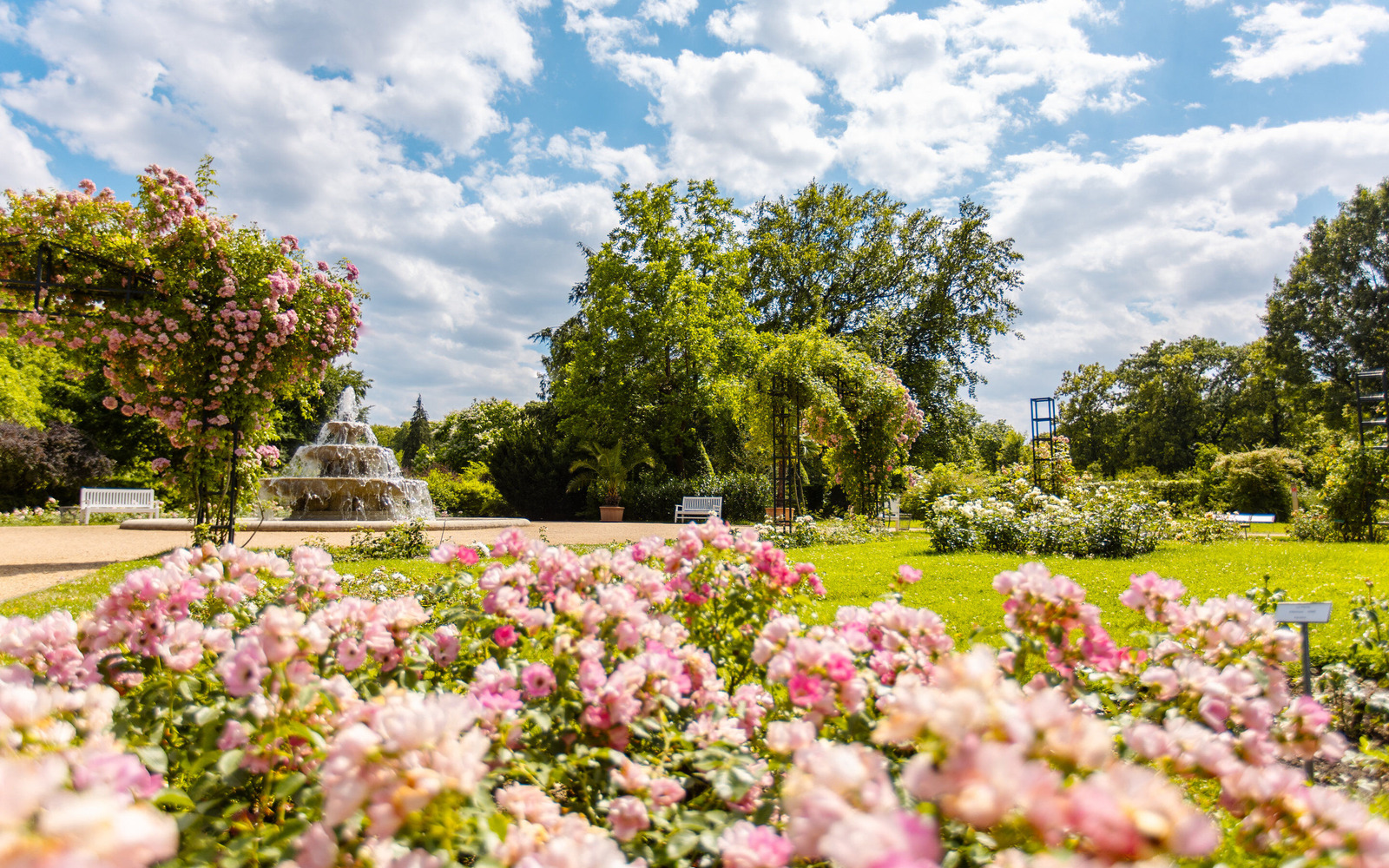 Heute finden die Besucher auf 17 ha zehntausende Rosenstöcke in fast 1.000 Sorten. Kunstvoll gefertigte Skulpturen, Pergolenhöfe, romantische Wasserspiele, Gartenbereiche im Charakter des Jugendstils und Parkelemente im englischen Landschaftsstil laden zum Verweilen ein.