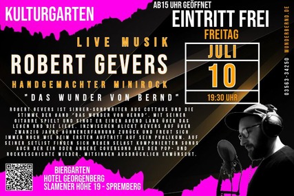 "Das wunder von Bernd" Robert Gevers ist Singer-Songwriter aus Cottbus und die Stimme der Band "Das Wunder von Bernd". Mit seiner Gitarre spielt und singt er einen Abend lang über das Leben und die Liebe. Inzwischen blickt Gevers auf über zwanzig Jahre Bühnenerfahrung zurück und freut sich immer noch wie beim ersten Auftritt auf sein Publikum. Auf seiner Setlist finden sich neben selbst komponierten Songs auch der ein oder andere Coversong aus der Pop- und Rockgeschichte wieder. Mitsingen ausdrücklich erwünscht.