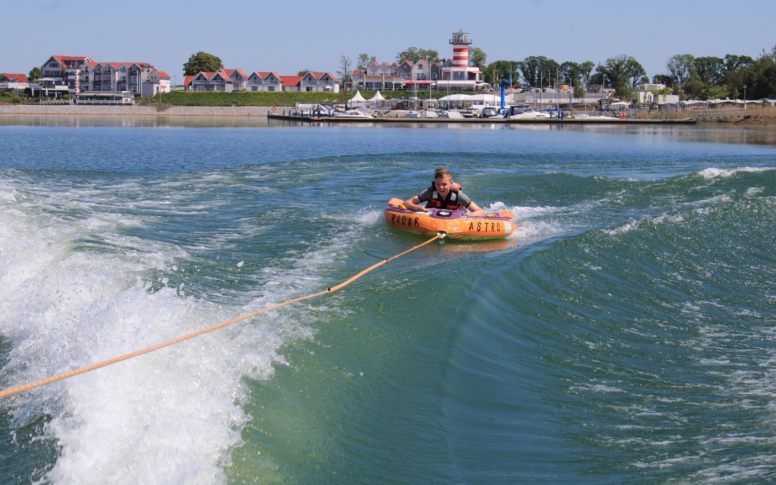 Das sogenannte "Tube Riding", wo ein mit Luft gefülltes Kissen hinter dem Boot hergezogen wird, ist ebenso Teil des Angebotes und ein riesengroßer Spaß für Groß und Klein.