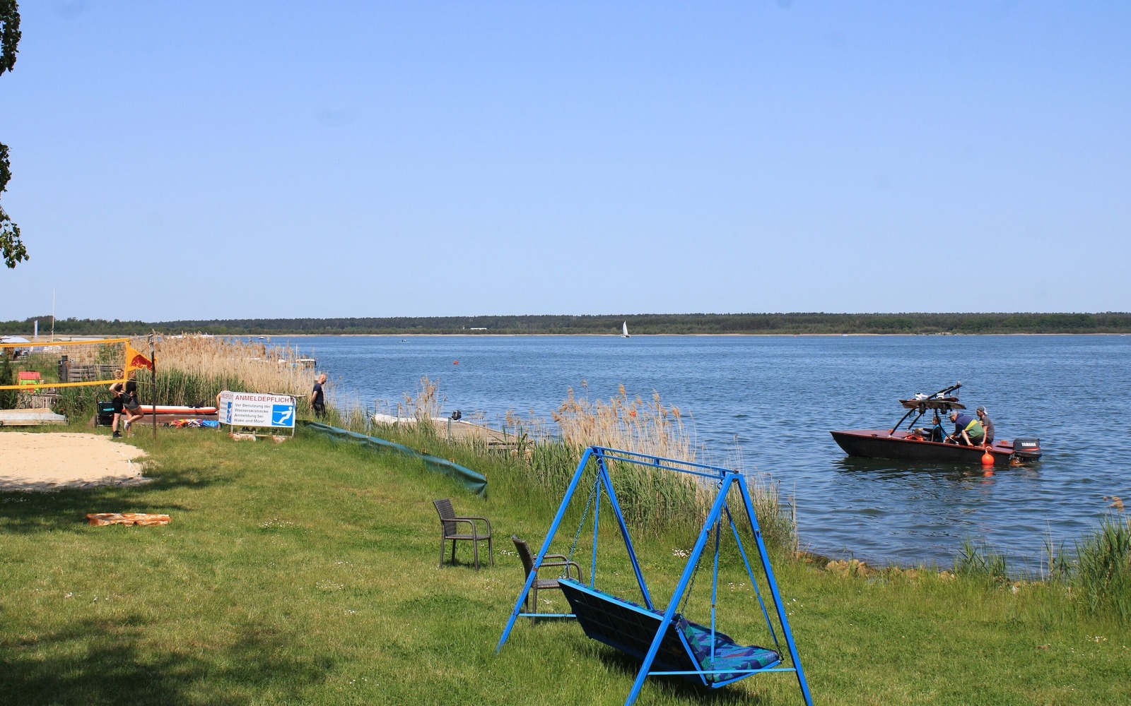 Anschließend oder währenddessen können in der Wake-Bar auf dem Gelände kühle Getränke und ein Imbiss eingenommen werden. Entspannt werden kann sich auf der Strandterrasse, welche einen wunderschönen Blick über den Geierswalder See bietet und wo man das Wasserspektakel aus sicherer Entfernung bestaunen kann.