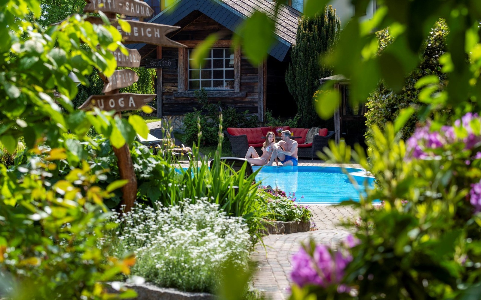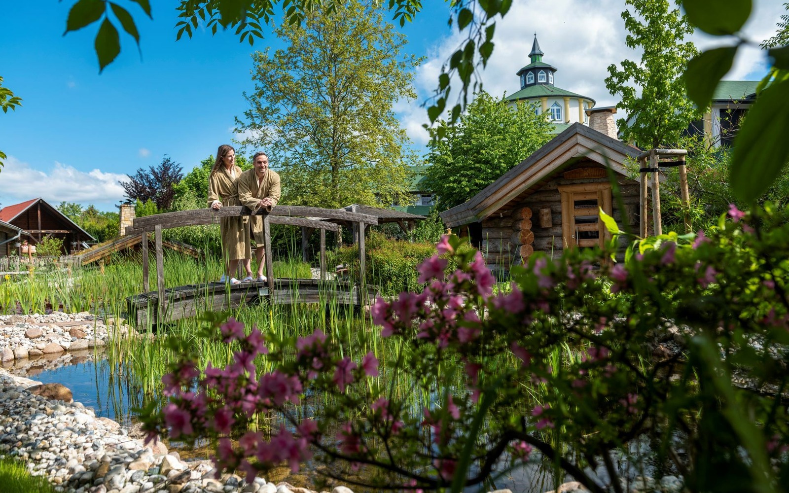 Ein idyllischer Wellnessgarten mit verschlungenen Wegen, Quellen, Brücken und Teichen integriert sich in das weitläufige SPA. Entdecken Sie versteckt im Grünen das duftende Brotstübchen, ein türkisches Hamam oder das urige Kräuterstübchen nahe der kaminbefeuerten Erdsauna.