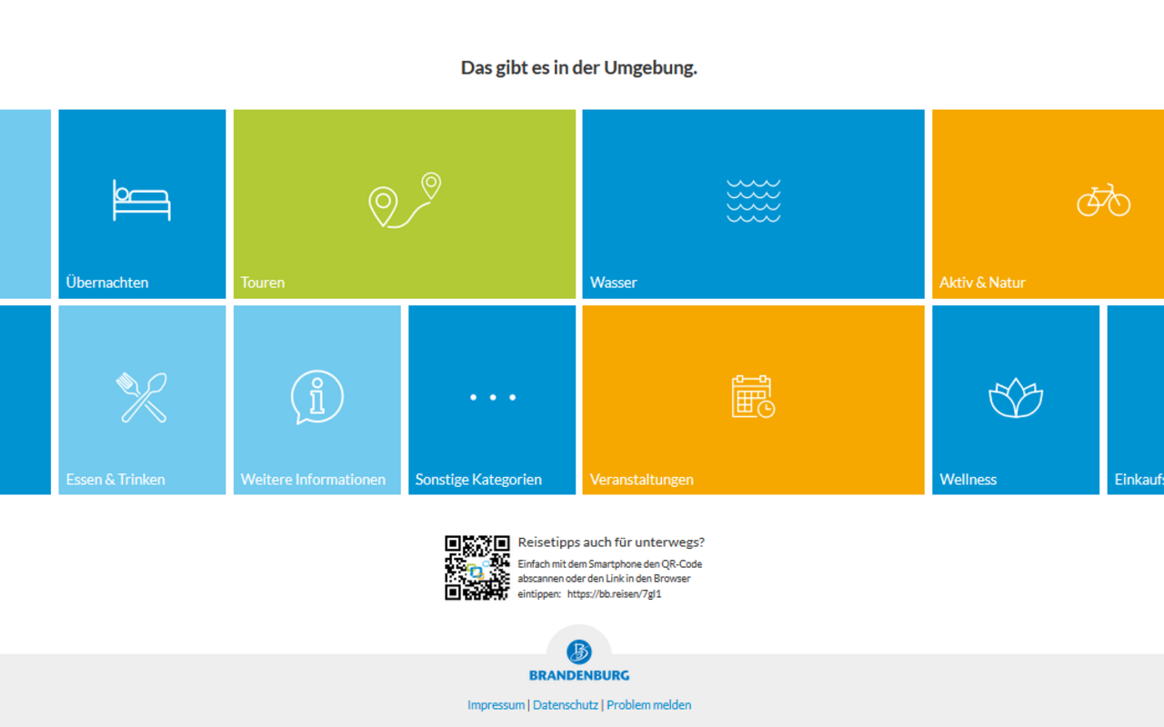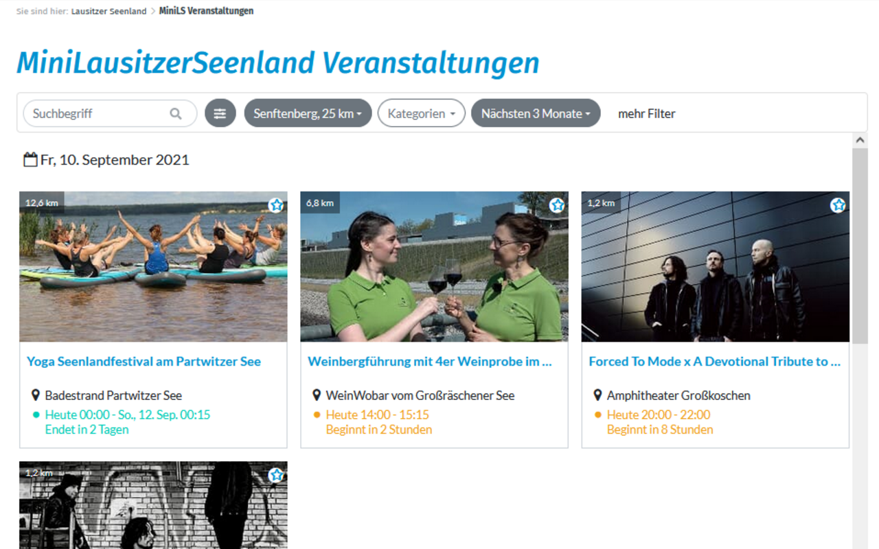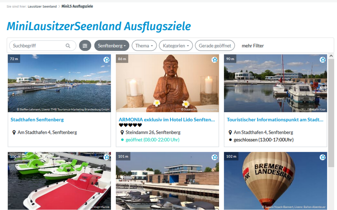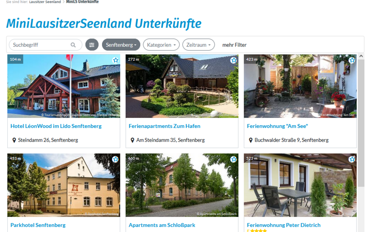 Auf vielen Webseiten von Gastgebern und Anbietern gibt es den Punkt „Umgebung" oder „Ausflugsziele". Aber wie soll dieser mit Bildern gefüllt, gepflegt und aktuell gehalten werden? Und von wem? Mit der Funktion „MiniLausitzerSeenland" können aktuelle Veranstaltungen, Touren in der Umgebung, Gastronomie und Unterkünfte und vieles mehr aus den auf der eigenen Webseite einfach und kostenfrei eingebunden werden. Als Bestandteil von „MiniBrandenburg" handelt es sich dabei um ein Angebot der TMB Tourismus-Marketing Brandenburg GmbH.