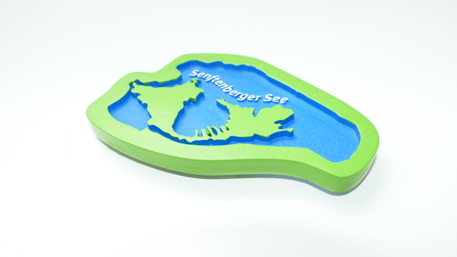Ein typisches Mitbringsel und häufig gekauftes Souvenir ist der plastische 3D-Magnet mit dem Senftenberger See und seiner Insel. Mit einem starken Magneten auf der Rückseite haftet er an allen Metall-Oberflächen wie Magnettafeln oder Kühlschrank.