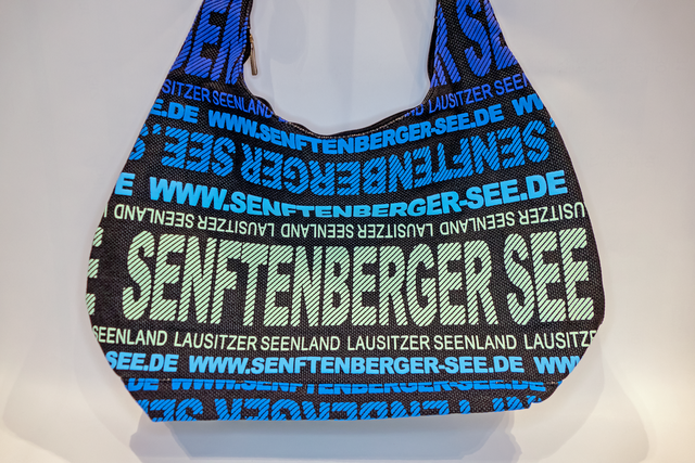 Gut ausgestattet für Strand, Freizeit und Shopping sind Sie mit dieser großen Schultertasche unterwegs. Die Grundfarbe der Tasche ist schwarz mit Namensaufdruck "Senftenberger See" in blauen und grünen Farben.