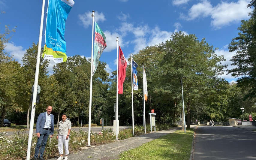 Bildunterschrift: Stefan Palm, Werkleiter Eigenbetrieb Kultur, Tourismus, Marketing Rosenstadt Forst (Lausitz) sowie Parkmanager und Kathrin Winkler, Geschäftsführerin des Tourismusverbandes Lausitzer Seenland e.V. nach dem Hissen der Lausitzer Seenland Fahne auf dem Parkplatz am Ostdeutschen Rosengarten in Forst (Lausitz) im Sommer