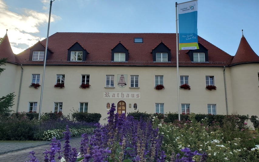 Foto: Lausitzer Seenland Fahne weht vor dem Rathaus in Lauta
