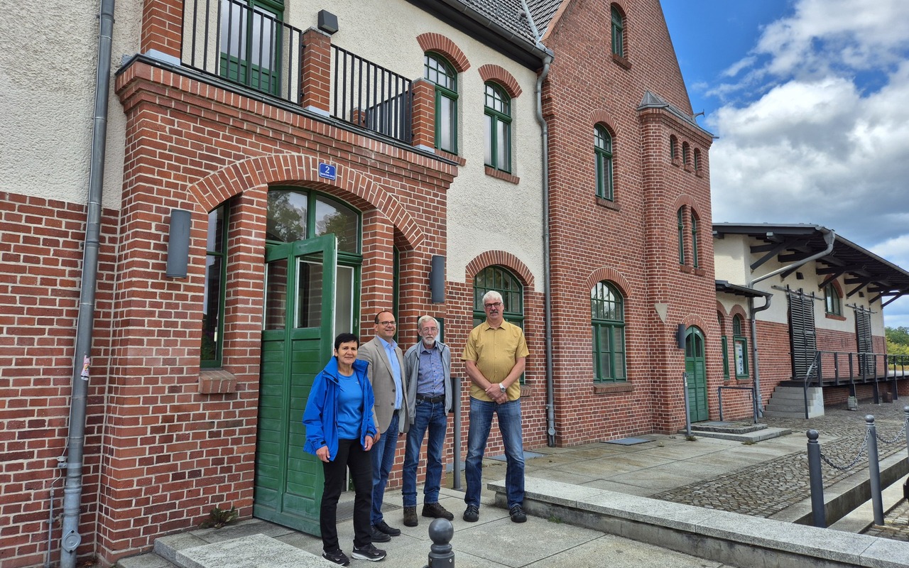 Bildunterschrift: Staatssekretär Tobias Dünow (2. v. l.) zu Besuch im Lausitzer Seenland: Vor dem Gebäude des Bergbautourismus-Vereins ‚Stadt Welzow‘ e.V. mit Kathrin Winkler (li.), Geschäftsführerin des Tourismusverbandes Lausitzer Seenland, Hilmar Mißbach (re.), Bürgermeister der Stadt Welzow, und Siegfried Laumen (2. v. r.), geschäftsführender Vorstand des Bergbautourismus-Vereins.