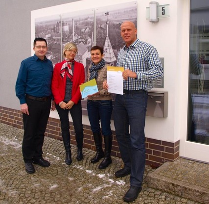 Bildunterschrift: Kathrin Winkler, Geschäftsführerin des Tourismusverbandes Lausitzer Seenland e.V. (2. v. rechts) übergibt die Urkunden und das Klassifizierungsschild an die Inhaber Veit und Doreen Burmeister und Geschäftsführer Thomas Kühne (1. v. links) vor dem Apartmenthaus "Am Fließ" in Hoyerswerda.