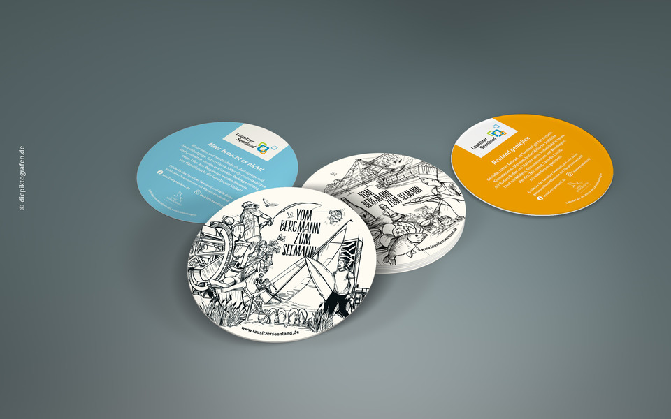 Mit der Kampagne „Vom Bergmann zum Seemann“ will der Tourismusverband Lausitzer Seenland e.V. Aufmerksamkeit für den einmaligen Wandel vom Bergbaurevier zur Urlaubsregion mit mehr als 20 Seen und schiffbaren Kanälen schaffen. Gemeinsam mit der Agentur Die Piktografen GmbH und der Textwerkstatt Ute Baumgarten wurden Illustrationen entwickelt, die Einheimischen und Urlaubern die Geschichte des Lausitzer Seenland verständlich und positiv vermitteln sollen. Die Idee dahinter: Illustrationen machen neugierig. Entstanden sind Bilder, die viel erzählen. Die Illustrationen zeigen beispielhaft neue Häfen, Förderbrücken, schwimmende Häuser, Bergbaugeräte, Leuchttürme, Bergmänner, Schiffe und Urlauber, die Radfahren, Baden oder Boot fahren. Sie zieren Postkarten, Bierdeckel, Prospekte, Malbücher, Banner und Planen. Die Kampagne richtet sich sowohl an Gäste als auch an die einheimische Bevölkerung. Partner aus dem Tourismus, der Wirtschaft sowie Kommunen und Landkreise wurden und werden in die Kampagne einbezogen. Ziel ist es, die Attraktivität und Bindungskraft der Region zu stärken, die Aufbruchsstimmung zu zeigen und auf ihre Zukunftsfähigkeit aufmerksam zu machen. „Die Illustrationen fallen auf. Der einmalige Landschaftswandel wird mit den gezeichneten Botschaften auf eine originelle und spannende Art und Weise erzählt. Sie bringen die Geschichte des Lausitzer Seenland auf den Punkt“, so Kathrin Winkler, Geschäftsführerin des Tourismusverbandes Lausitzer Seenland e.V. Das Projekt wurde aus Mitteln des Lausitzbeauftragten des Landes Brandenburg gefördert.
