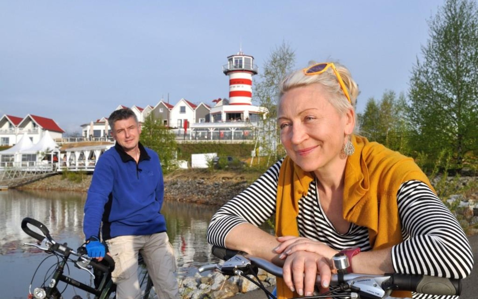 Nicht weit vom Schiefen Turm am Senftenberger See finden Radfahrer die passende Übernachtungsmöglichkeit in luftiger Höhe. Im Hafencamp stehen auf drei bis fünf Meter hohen Stelzen vier Baumhäuser inmitten von Kiefern. Es sind gemütliche Ferienwohnungen für zwei Personen mit Balkon und Blick auf den See. Vom 20. September bis 31. Oktober kann die Aktion „Baumhauszeit“ inklusive Frühstück, Motorbootfahrt und Miete von Tretrollern gebucht werden.