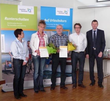 Zur Informationsveranstaltung für touristische Anbieter am 7. April konnten der stellvertretende Vorstandsvorsitzende des Tourismusverbandes Lausitzer Seenland e.V. Siegurd Heinze (rechts), Kathrin Winkler, Geschäftsführerin des Tourismusverbandes Lausitzer Seenland e.V. (1.v.l.) und Roman Krautz, Stabsstelle "Projektsteuerung Landschaftspark Bärwalder See" (4.v.l.) den Vermietern Noreen Knoppik, Mitarbeiterin PR der St37 Wilde & Wilde GbR/Lausitz Resort (2.v.l.) und Heribert Mocha, Inhaber Pension Heideland (3.v.l.) die Urkunden überreichen.