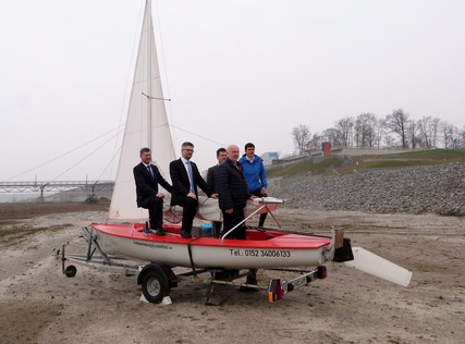 Bildunterschrift: Die Besatzung des Tourismusverbandes Lausitzer Seenland e.V. gemeinsam in einem Boot auf dem Grund des Großräschener Sees vor den IBA-Terrassen.