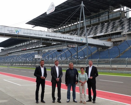Bildunterschrift Foto Nr. 1 (v. l. n. r.): Klaus Prietzel, Vorstand Förderverein Lausitz Ring e.V. und Bürgermeister Gemeinde Schipkau, Siegurd Heinze, Mitglied Förderverein Lausitz Ring e.V., Landrat Landkreis Oberspreewald-Lausitz und Vorstandsvorsitzender Tourismusverband Lausitzer Seenland e.V., Josef Meier, Geschäftsführer der EuroSpeedway Verwaltungs GmbH, Kathrin Winkler, Geschäftsführerin Tourismusverband Lausitzer Seenland e.V. und Andreas Fredrich, Vorstand Förderverein Lausitz Ring e.V. und Bürgermeister Stadt Senftenberg freuen sich über die prominente Werbefläche für das Lausitzer Seenland am Lausitzring