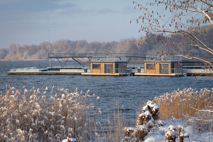 Saunaflöße am Stadthafen Senftenberg im Winter
