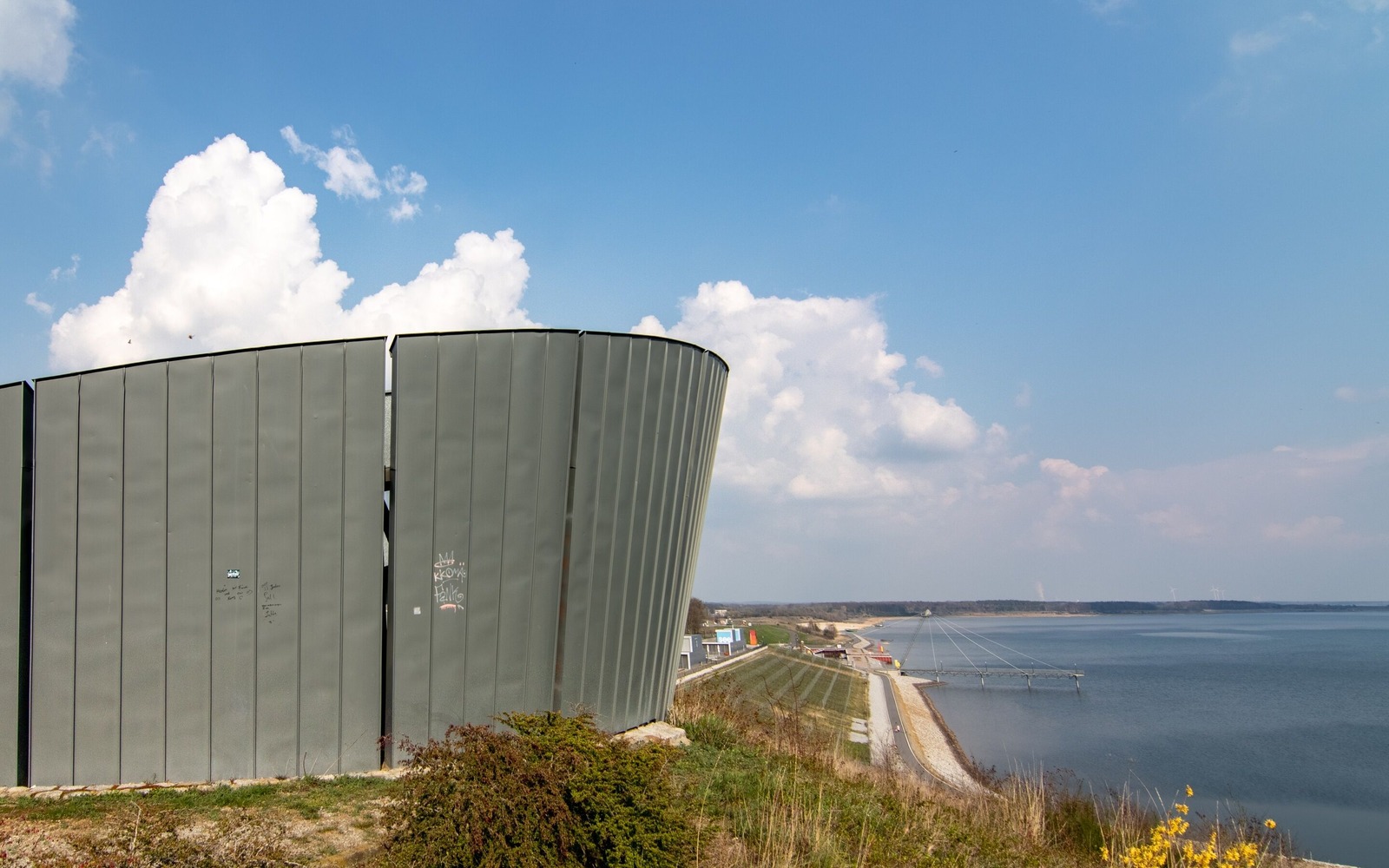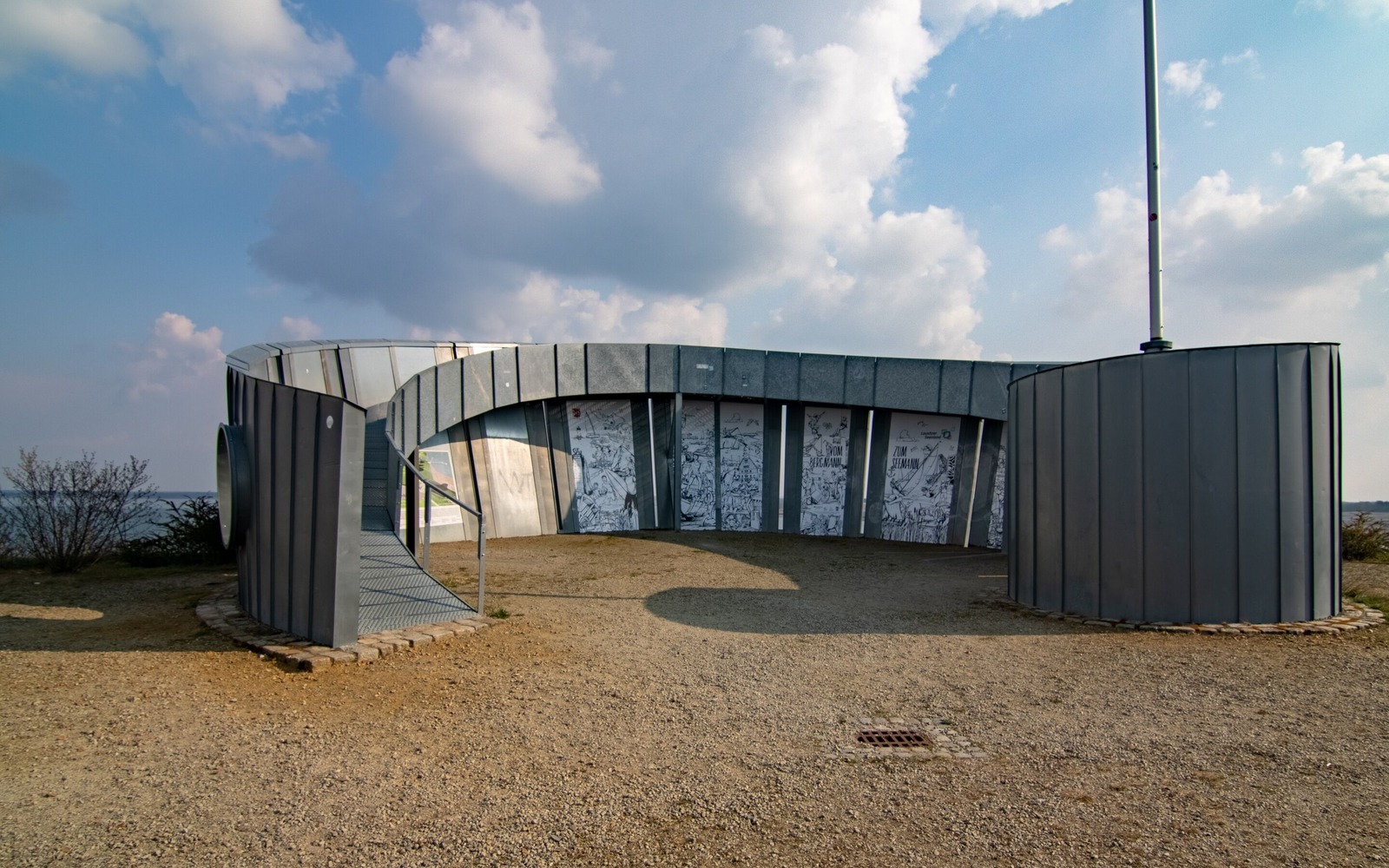 The Victoriahöhe viewpoint provides a panoramic view of Lake Großräschener, the IBA Terraces, pier, vineyard, Großräschen harbour and the Avenue of Stones. The Victoriahöhe viewpoint is a heap created from dumped material from the former Meuro surface mine on the site of the former Victoria I briquette factory. The small hill is crowned by a steel viewing platform, designed to look like a ship, about 138 metres above sea level. Information panels explain what can be seen in the distance and remind visitors of villages that have disappeared into the surface mining pit. On a clear day, you might even be able to see the stand of the Lausitzring race track and the power stations at Schwarze Pumpe and Jänschwalde. The striking viewpoint is adorned from the inside with illustrations from the campaign "From Miner to Mariner". They show new harbours, conveyor bridges, floating houses, mining equipment, lighthouses, miners, ships and vacationers, cyclists, bathers or boaters.