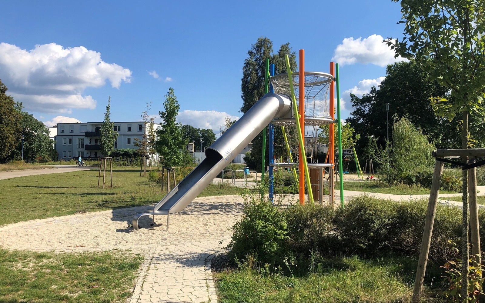 The playground is located in a well-maintained, traffic-calmed area in Hoyerswerda and consists of several age-appropriate play areas. For toddlers, there is a play area with a small climbing frame, a slide, and various balancing and climbing elements. The ground is covered with fine sand, which provides additional safety. In the immediate vicinity is a double swing with a disc-shaped net seat, suitable for several children at the same time.