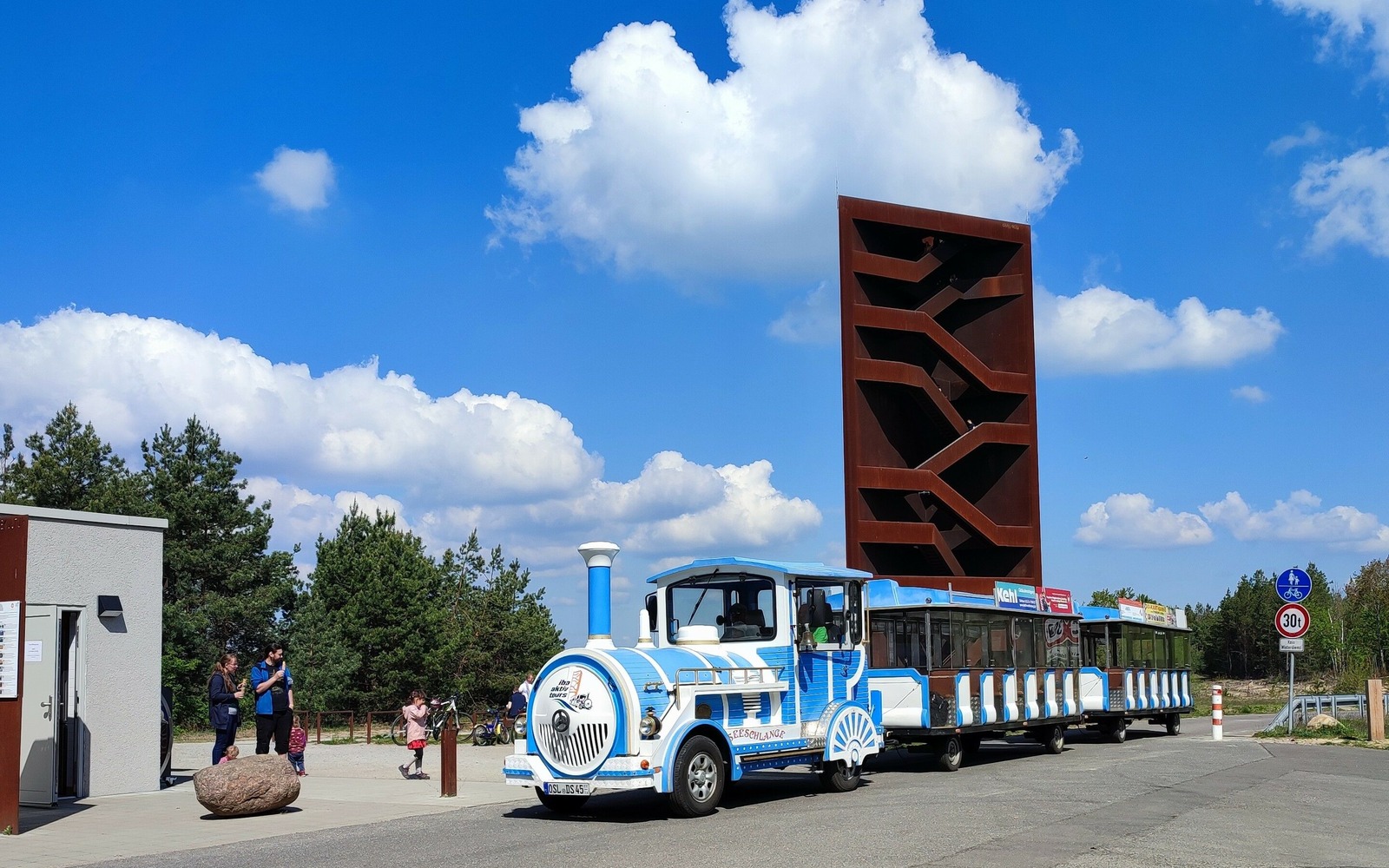 Visitors are introduced to the emerging Lusatian Lake District on a trip on the Seeschlange road train. The tourist train on wheels runs along the cycle paths, offering visitors views of the emerging lakes with their navigable canals and viewpoints. The trip includes a lively commentary from experts. The Seeschlange seats 42 visitors and features a ramp so that wheelchair-users and prams can also be transported.