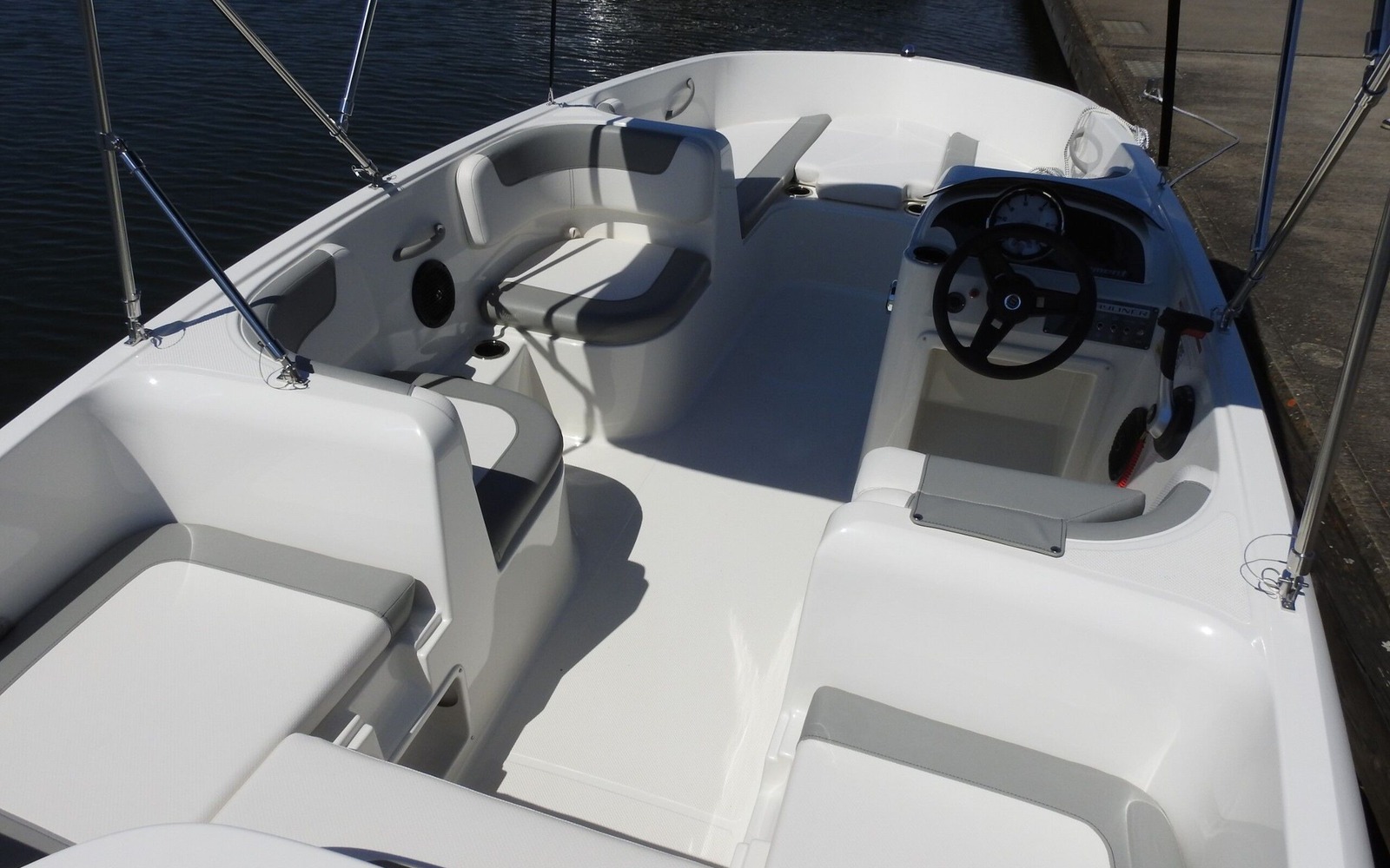 The licence-free motorboat "Element" is a comfortable boat for 5 people. Sun worshippers have plenty of room to sunbathe on the front with a spacious sunpad. There is also a bimini top (sun canopy), a bathing platform with bathing ladder, a 12 V connection and a radio with AUX connection.