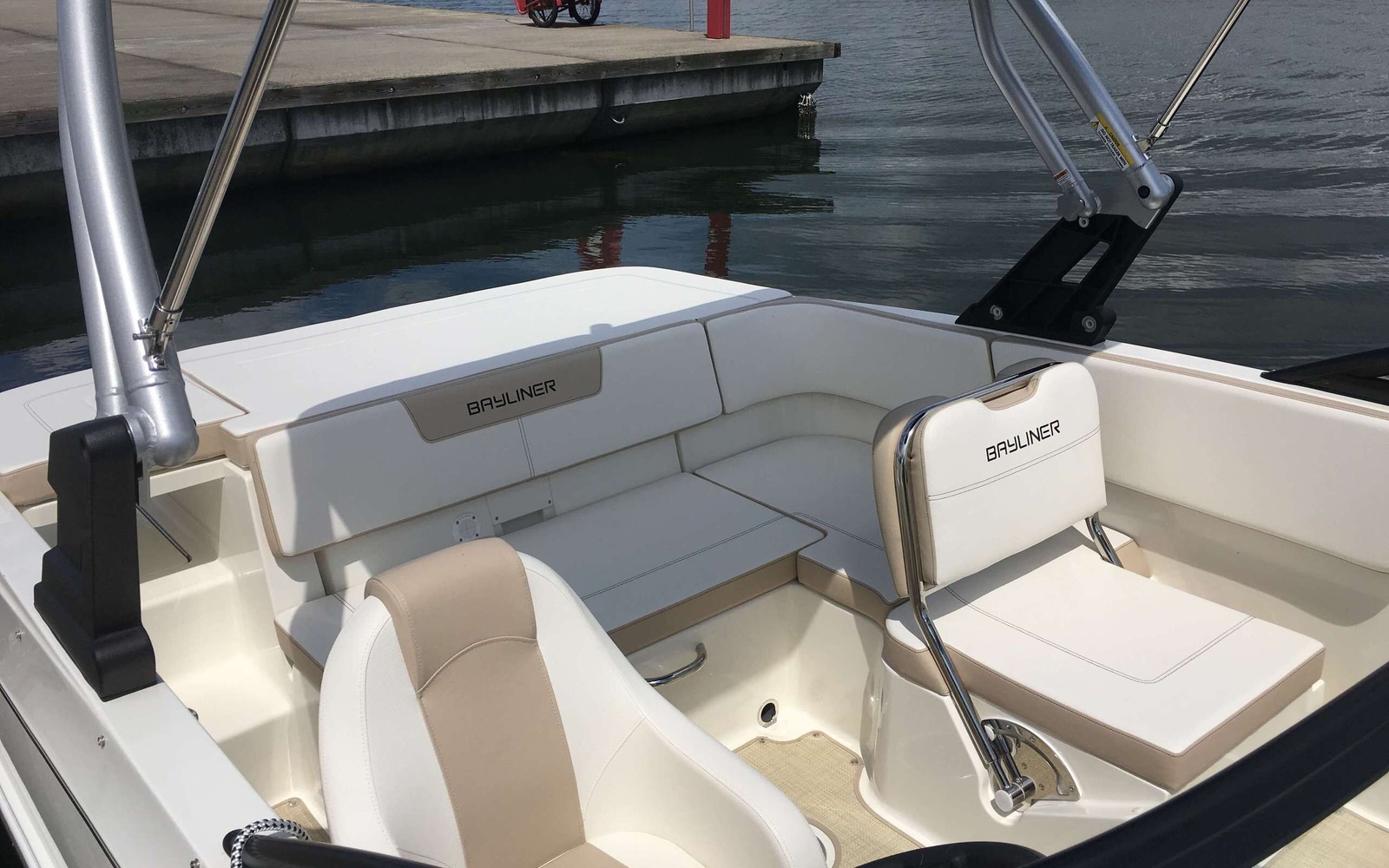 For leisure captains who want more power on board, the "VR5 Bowrider" sports boat, which requires a licence, offers 8 people an incredible amount of space on board. A bathing platform with bathing ladder, a bimini top, 12 V connection and a radio with AUX connection provide additional sailing and water fun.